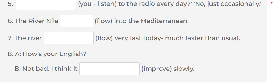 5. Do you listen to the radio every day? No, just occasionally. 6. The River Nile flows into the Mediterranean. 7. The river is flowing very fast today- much faster than usual. 8. A: How's your English? B: Not bad. I think it is improving slowly.