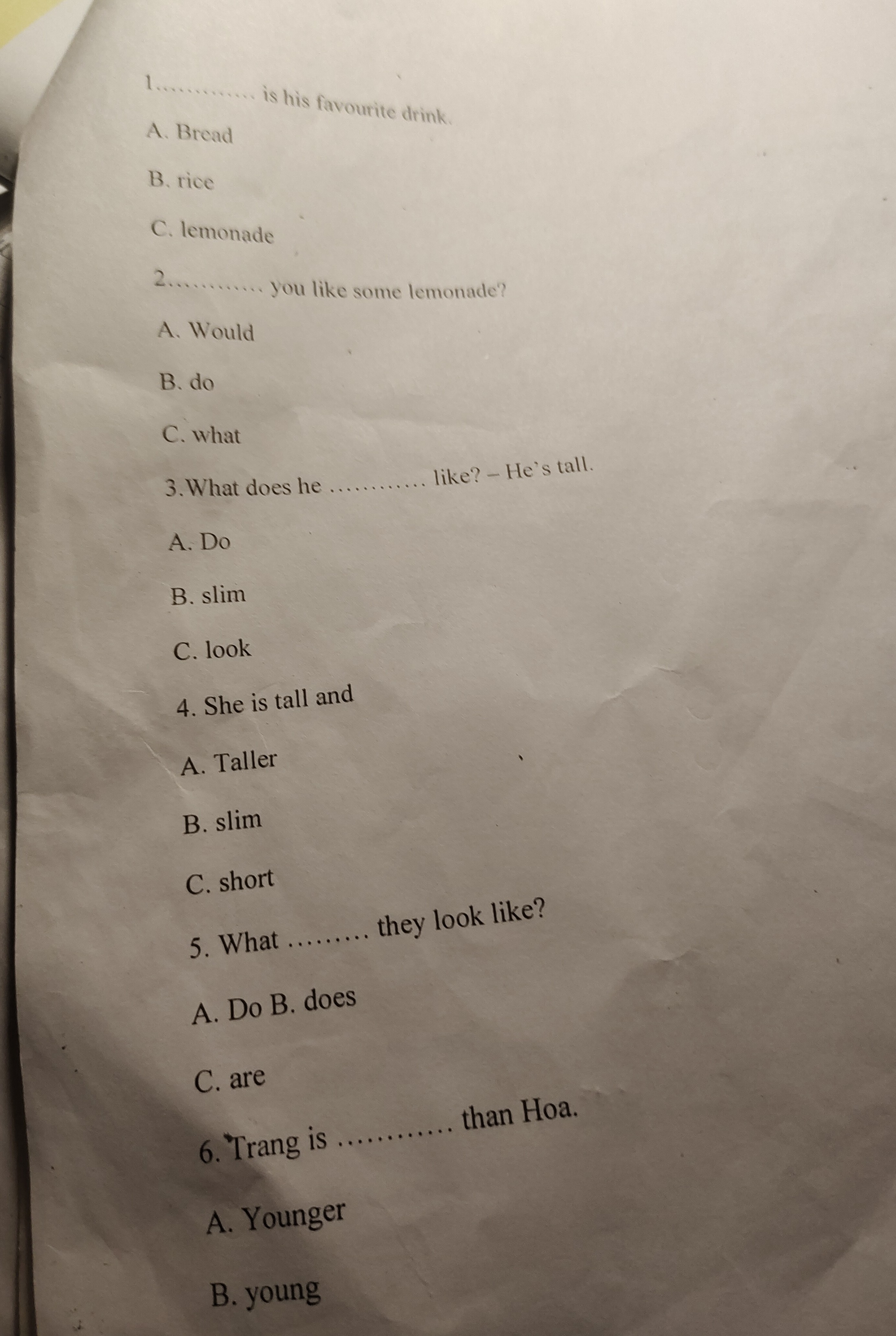 1. A. Broad 2. A. Would 3. B. slim 4. C. short 5. A. Do 6. A. Younger