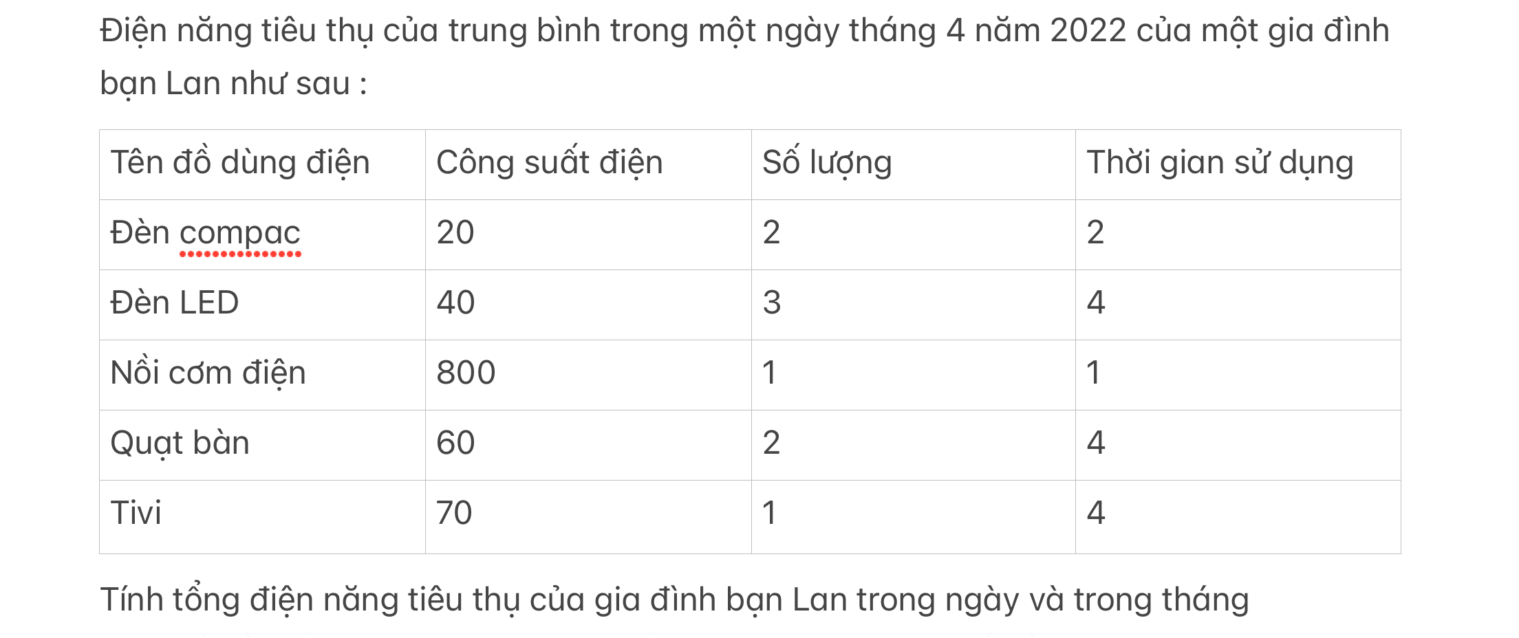 Điện năng tiêu thụ của từng đồ dùng điện trong nhà Lan được tính như trong hình