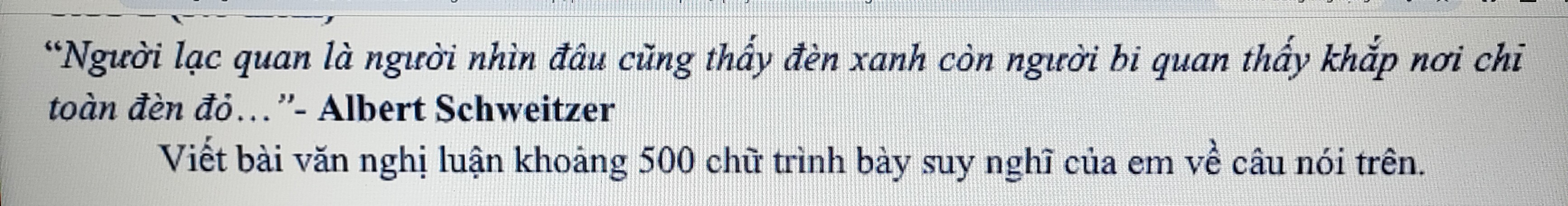 “Người lạc quan là người nhìn đâu cũng thấy đèn xanh còn người bi quan thấy khắp nơi chỉ toàn đèn đỏ… kẻ thực sự khôn ngoan thì mù màu” đây là câu nói của Albert Schweitzer. Câu nói thể hiện lên tinh thần lạc quan, lạc quan để cuộc sống tươi đẹp hơn. Chúng ta có lạc quan thì tinh thần mới sảng khoái, mới vui tươi làm việc. Đây là một yếu tố thúc đẩy là bước đà cho cuộc sống chúng ta tươi đẹp hơn.