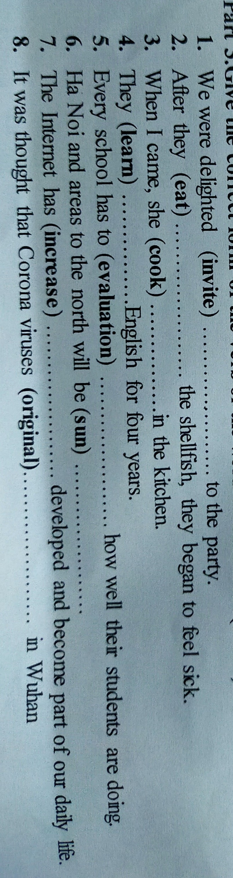1. We were delighted to be invited to the party. (Động từ ở dạng quá khứ phân từ được sử dụng để mô tả hành động đã xảy ra trước đó, trong trường hợp này là "invite").