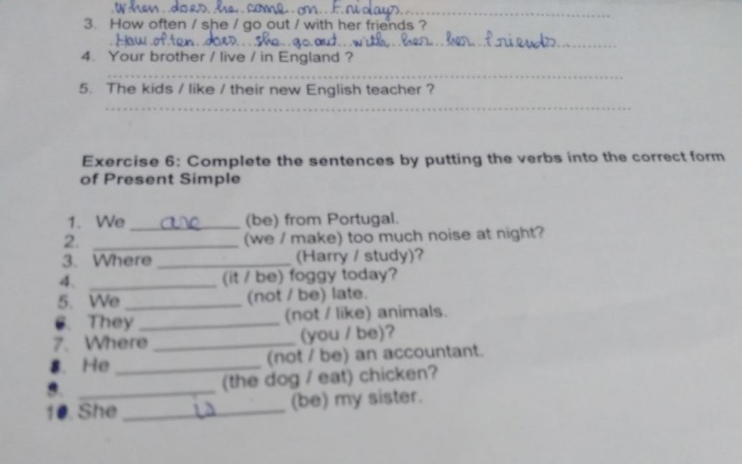 3. How often does she go out with her friends? 4. Does your brother live in England? 5. Do the kids like their new English teacher? Exercise 6: 1. are 2. Are we making 3. does Harry study 4. Is it foggy today? 5. are not late 6. do not like 7. are you 8. is not an accountant 9. Does the dog eat chicken? 10. She is my sister.