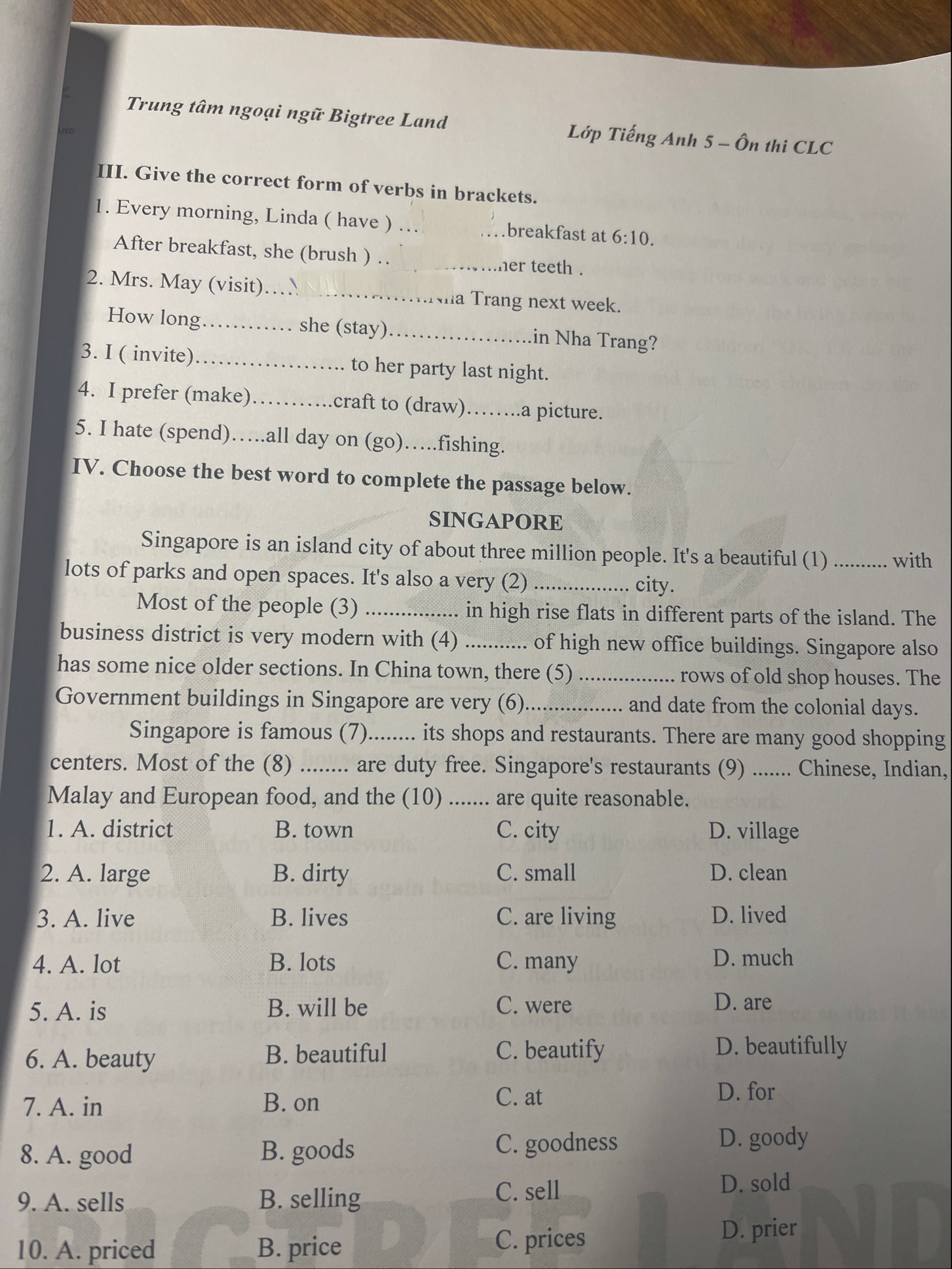 IV: 1. C. city 2. D. clean 3. A. live 4. B.lots 5. D. are 6. B. beautiful 7. D. for 8. B. goods 9. C. sell 10. C. prices