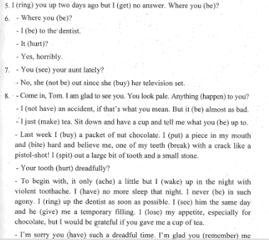 - To begin with, it only ached a little but I woke up in the night with violent toothache. I had no more sleep that night. I have never been in such agony. I rang up the dentist as soon as possible. I saw him the same day and he gave me a temporary filling. I lost my appetite, especcially for chocolate, but I would be grateful if you gave me a cup of tea.