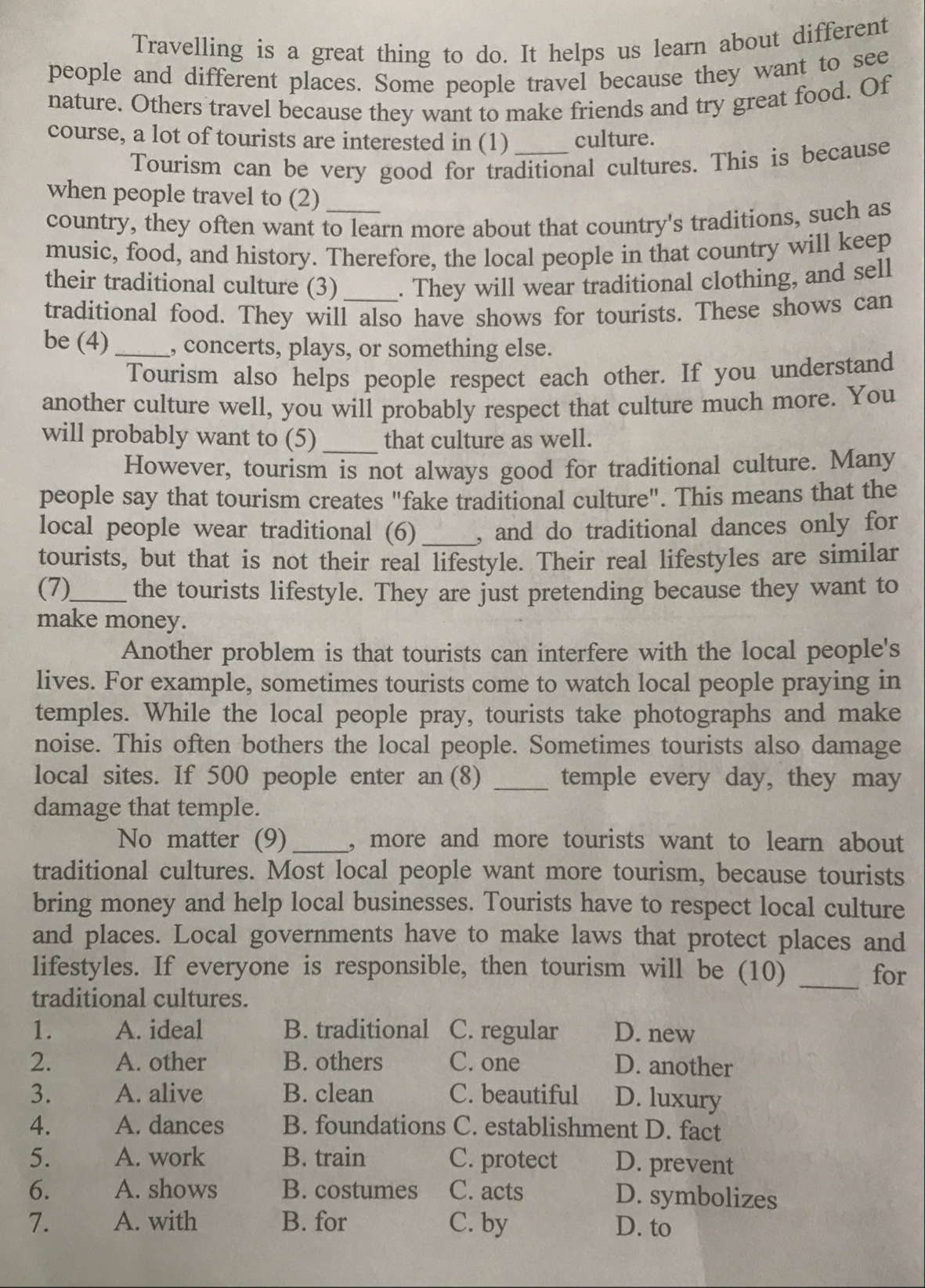 1. B. traditional 2. D. another 3. A. alive 4. A. dances 5. C. protect 6. B. costumes 7. D. to
