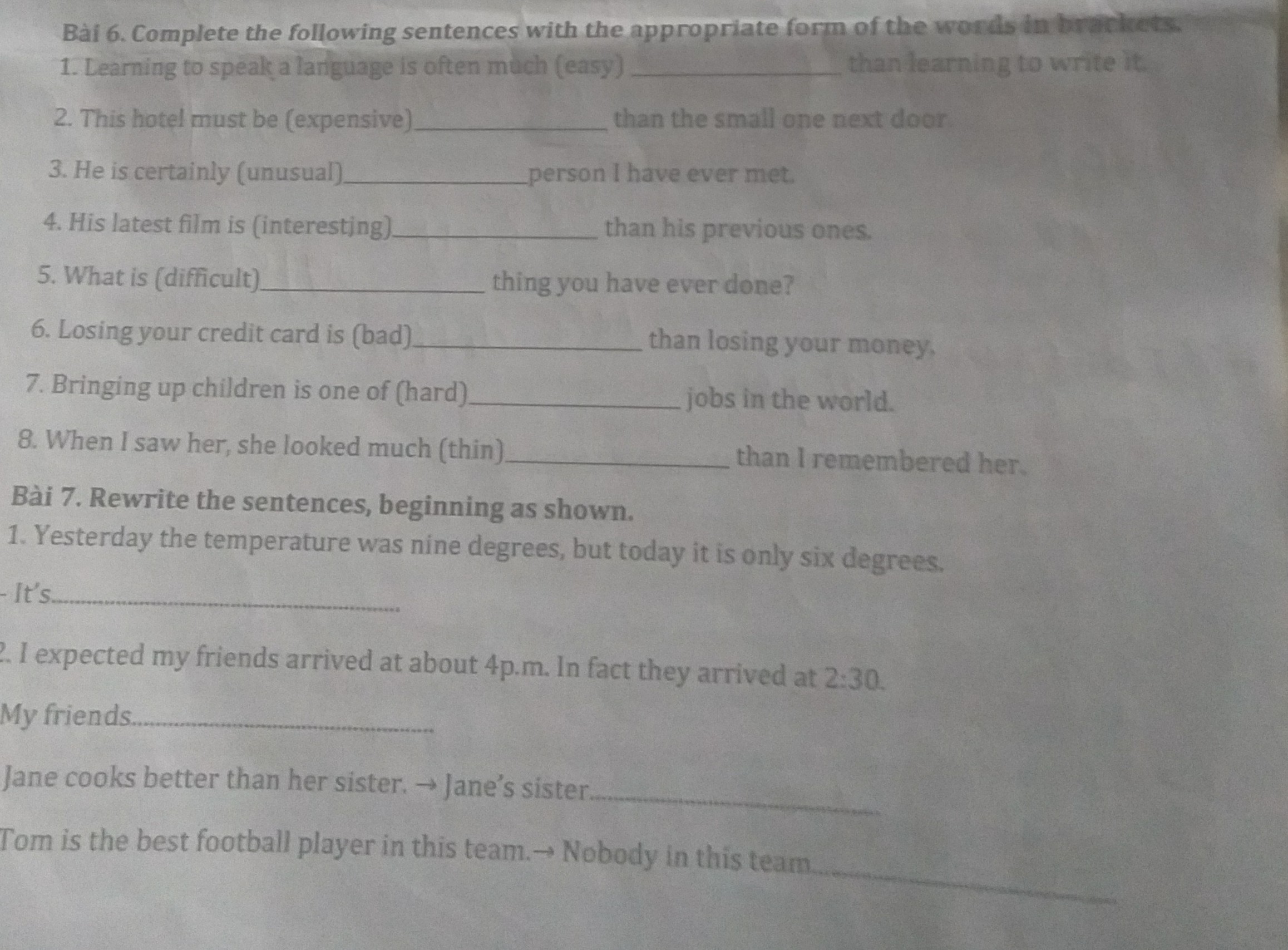 Bài 6. Hoàn thành các câu sau với dạng thích hợp của từ trong ngoặc.