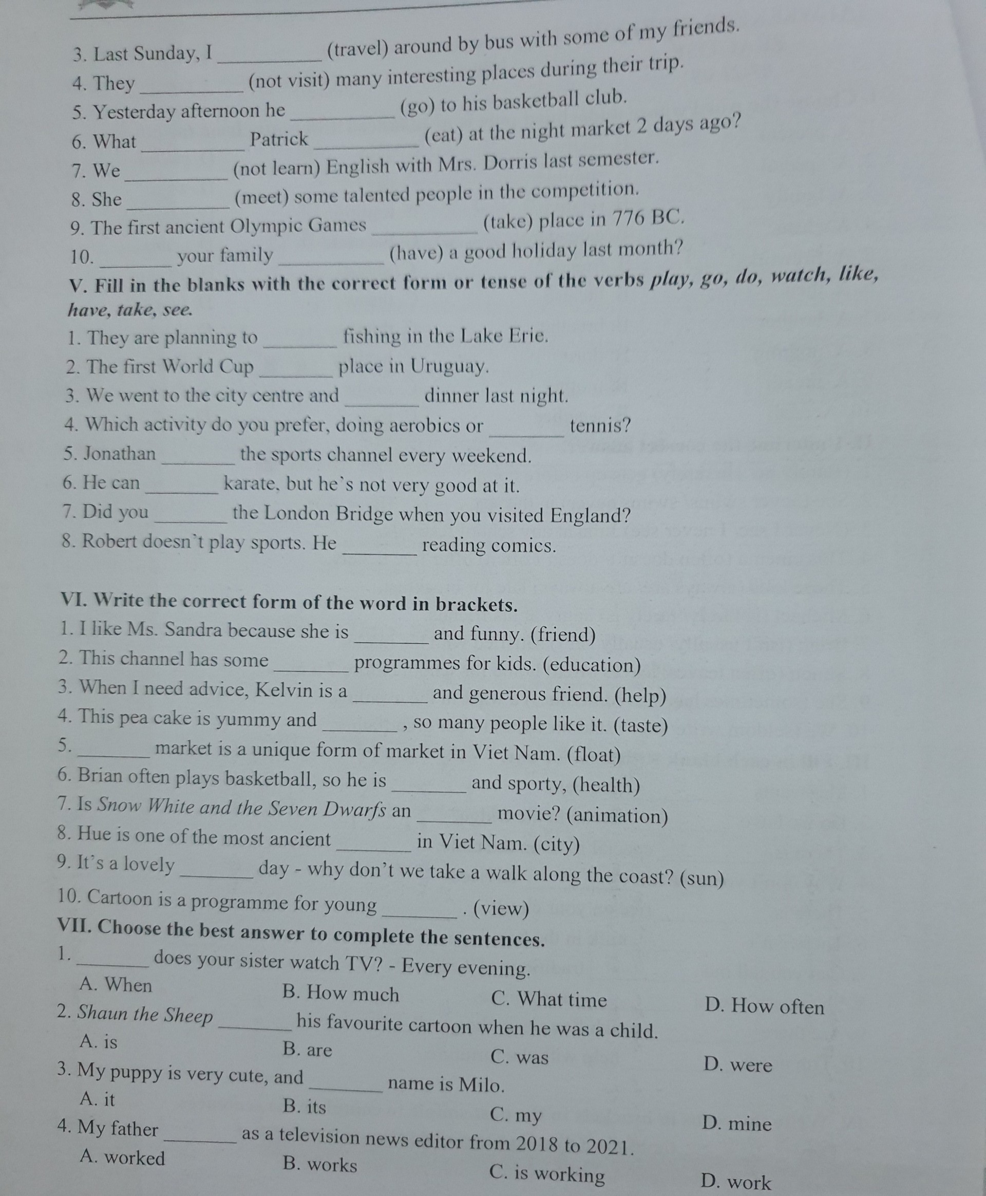 V. Fill in the blanks with the correct form or tense of the verbs play, go, do, watch, like, have, take, see.