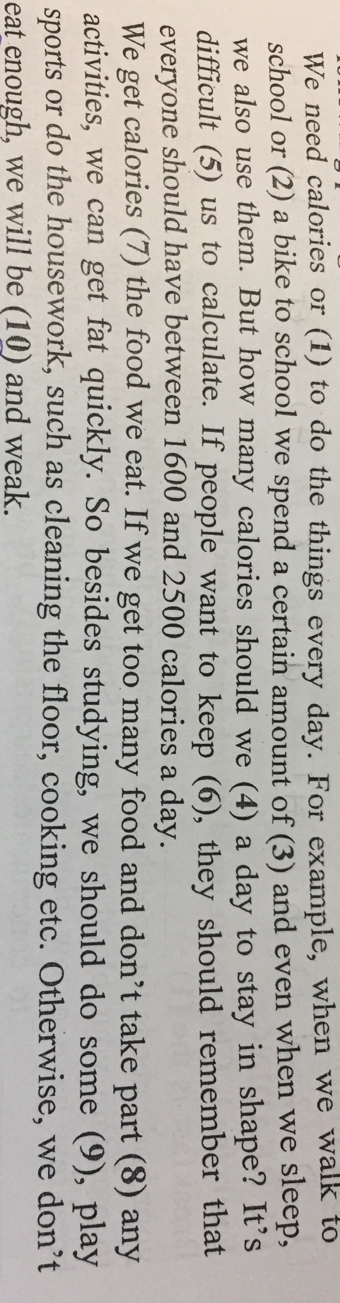 Chúng ta cần calo hoặc (1) để làm những việc hàng ngày. Ví dụ, khi chúng ta đi bộ đến trường hoặc (2) xe đạp đến trường, chúng ta tiêu hao một lượng nhất định (3) và thậm chí khi chúng ta ngủ, chúng ta cũng sử dụng chúng. Nhưng chúng ta nên ăn bao nhiêu calo mỗi ngày để giữ dáng? Điều này khá khó (5) tính toán. Nếu muốn duy trì (6), mọi người nên nhớ rằng mỗi người nên ăn từ 1600 đến 2500 calo mỗi ngày. Chúng ta lấy calo từ thức ăn chúng ta ăn. Nếu chúng ta ăn quá nhiều và không tham gia vào bất kỳ hoạt động nào (8), chúng ta có thể tăng cân nhanh chóng. Vì vậy, ngoài việc học, chúng ta nên làm một số (9), chơi thể thao hoặc làm việc nhà, như lau sàn, nấu ăn, v.v. Nếu không ăn đủ, chúng ta sẽ (10) và yếu đuối.