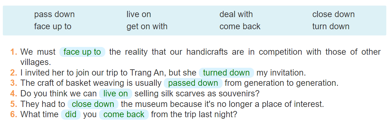 1. "Face up to" means to confront or acknowledge a difficult or challenging situation. In this sentence, it means that we need to acknowledge and accept the reality that our handicrafts are in competition with those of other villages. 2. "Turn down" means to reject or decline an offer or invitation. In this sentence, it means that the speaker invited someone to join their trip to Trang An, but the person declined or said no to the invitation. 3. "Pass down" means to transmit or hand down something from one generation to another. In this sentence, it means that the craft of basket weaving is traditionally handed down or taught from one generation to the next. 4. "Live on" means to sustain oneself financially or survive by doing something. In this sentence, it means that the speaker is asking if it is possible to sustain themselves financially by selling silk scarves as souvenirs. 5. "Close down" means to permanently shut or cease operations of a business or establishment. In this sentence, it means that the museum had to permanently shut down because it is no longer a place of interest. 6. "Come back" means to return to a place or to return from a trip. In this sentence, it is asking at what time the person returned from the trip last night.
