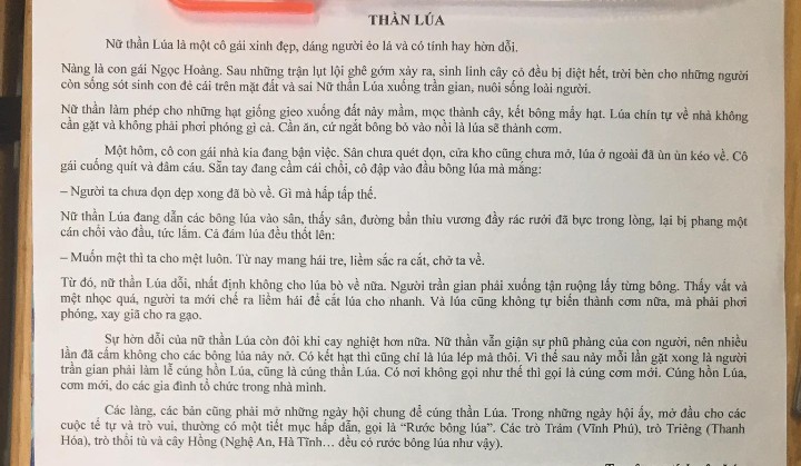 Văn bản kể về nguồn gốc của nghề trồng lúa và phong tục cúng Thần Lúa trong đời sống người Việt, thông qua hình tượng Nữ thần Lúa – người mang hạt lúa xuống trần gian để nuôi sống loài người. Đề tài thể hiện mối quan hệ gắn bó giữa con người với thiên nhiên, với cây lúa, đồng thời giải thích sự xuất hiện của các nghi lễ và tập quán cúng cơm mới, cúng hồn Lúa.