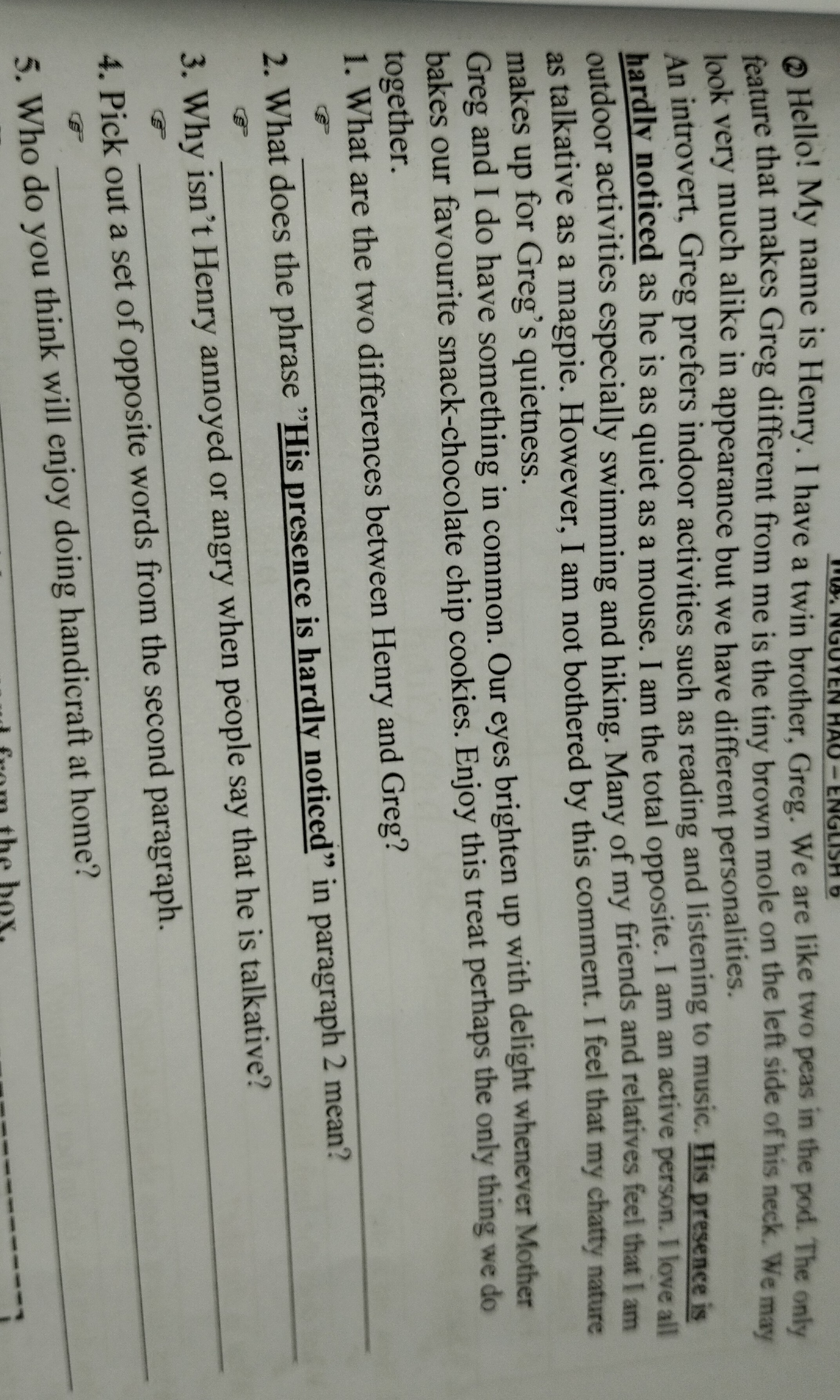 1. The two differences between Henry and Greg are their personalities and the presence of a tiny brown mole on the left side of Greg's neck.