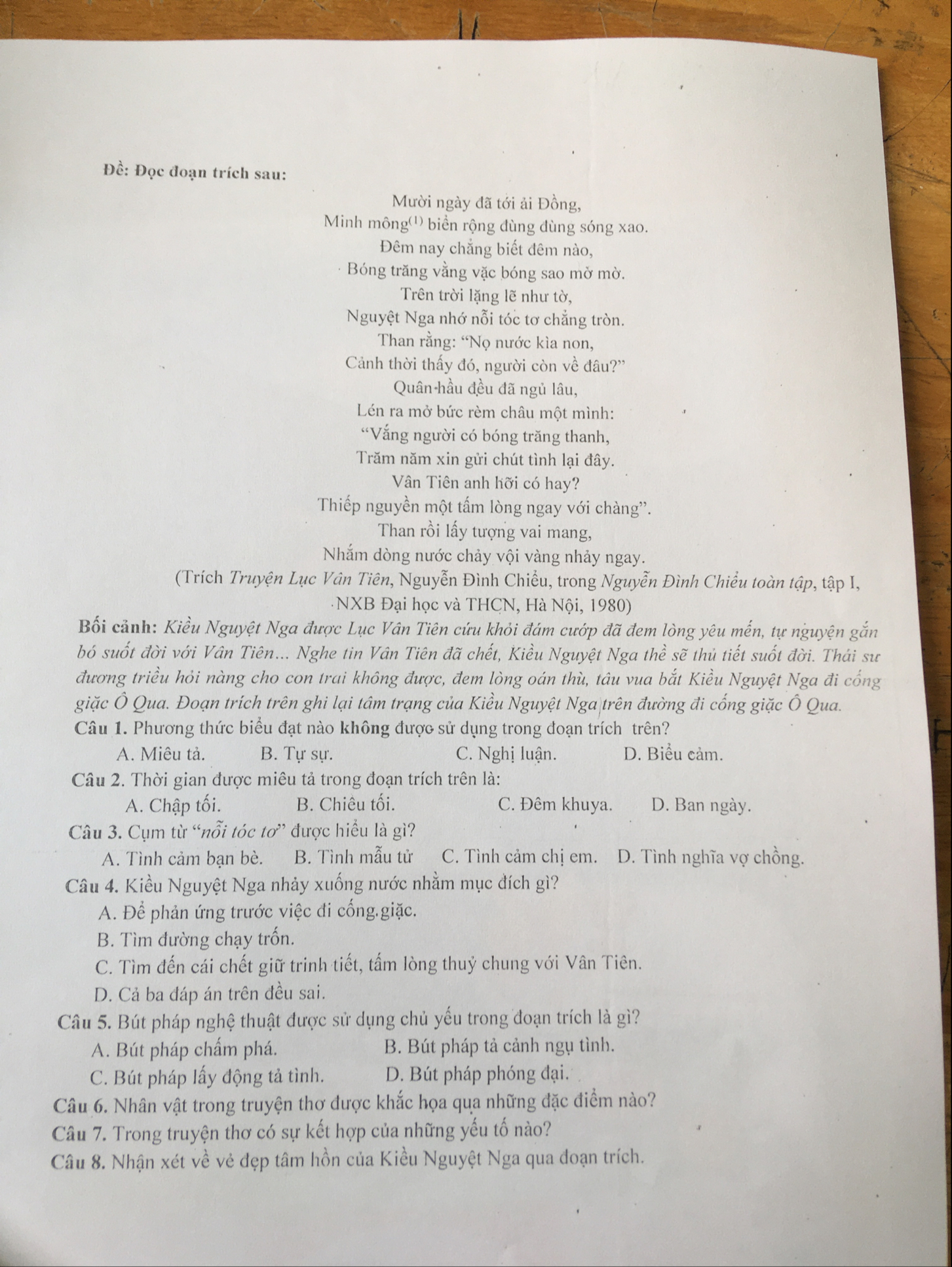 Câu 7/ Trong truyện thơ có sự kết hợp của các yếu tố miêu tả, tự sự và độc thoại trữ tình.
