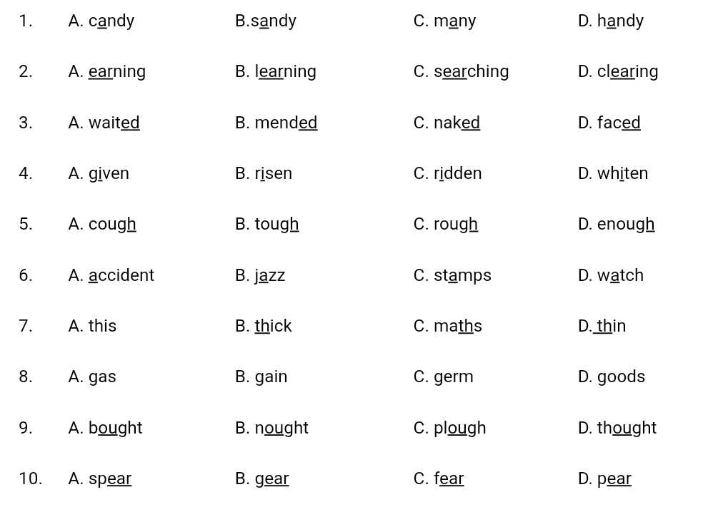 1. c 2. d 3. d 4. d 5. không có đáp án, âm gh trong 4 từ đều là /f/ 6. d 7. a 8. c 9. c 10. d