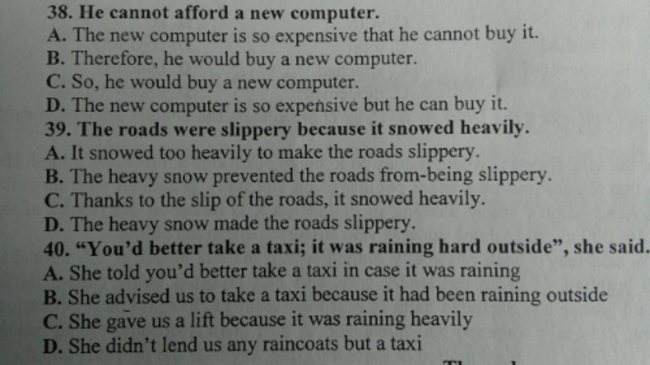 38. A. The new computer is so expensive that he cannot buy it. 39. D. The heavy snow made the roads slippery. 40. B. She advised us to take a taxi because it had been raining outside.