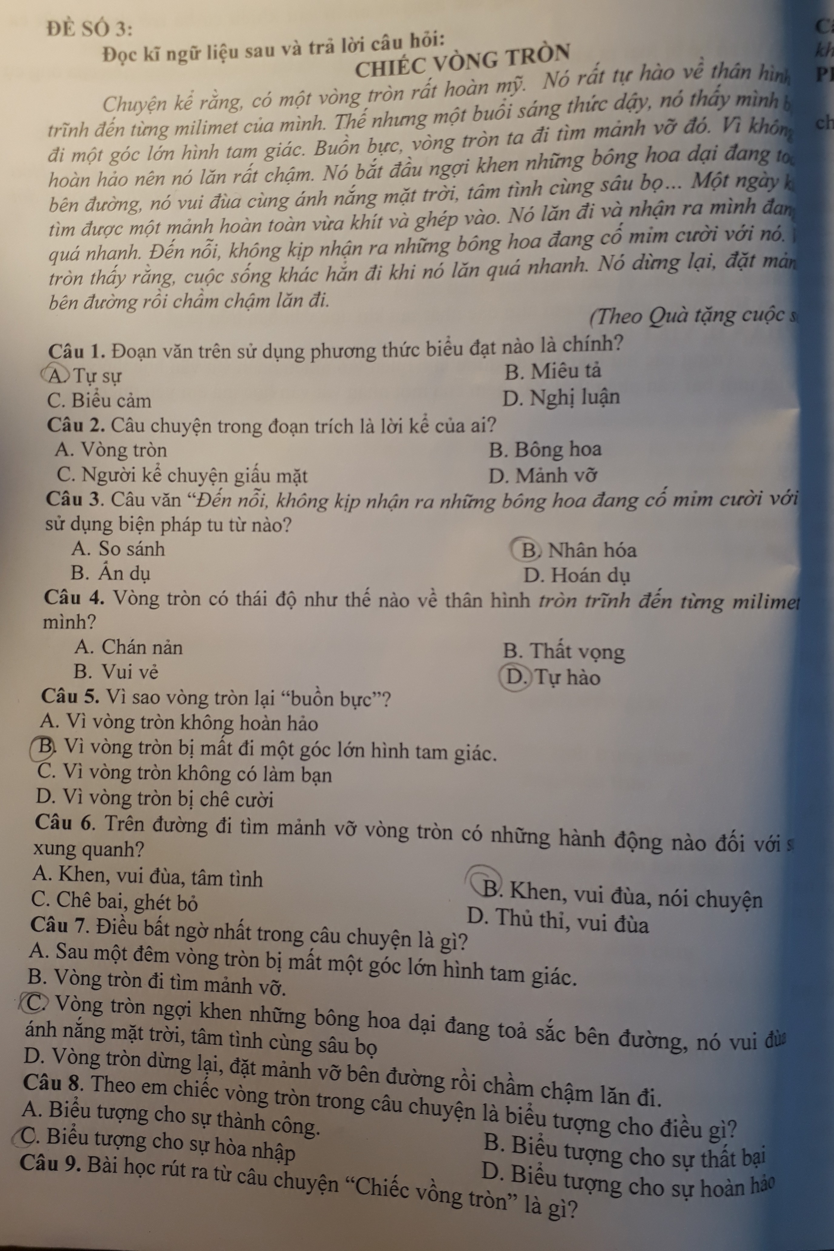CÂU 9: Bài học rút ra từ câu chuyện "Chiếc vòng tròn" là chúng ta cần chấp nhận khiếm khuyết của mình để hòa nhập với cộng đồng, không phải luôn hoàn hảo mới có thể sống hạnh phúc.