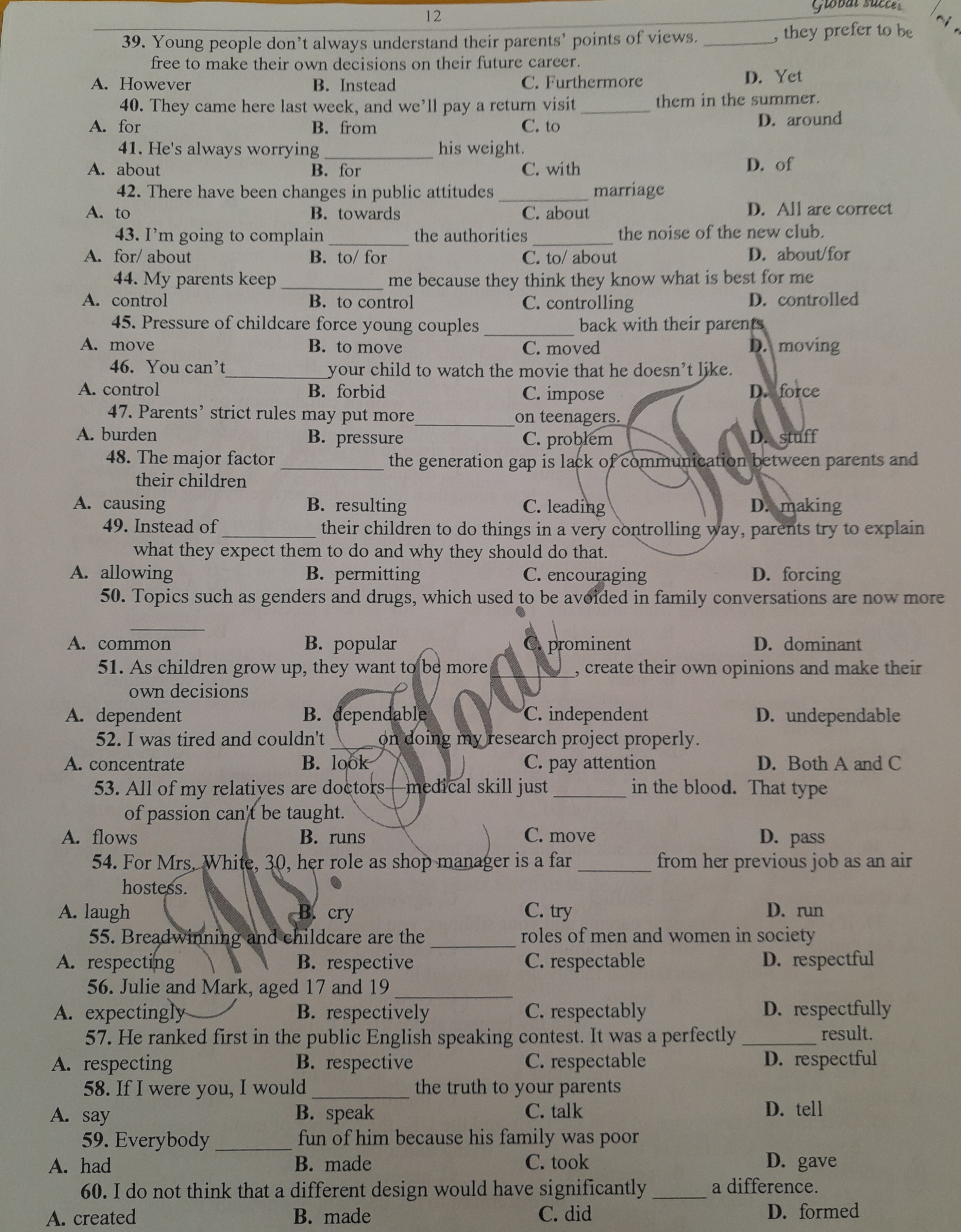 39. B 40. C. to 41. A. about 42. B. towards 43. C. to/about 44. C. controlling 45. B. to move 46. B. forbid 47. B. pressure 48. A. causing 49. D 50. A