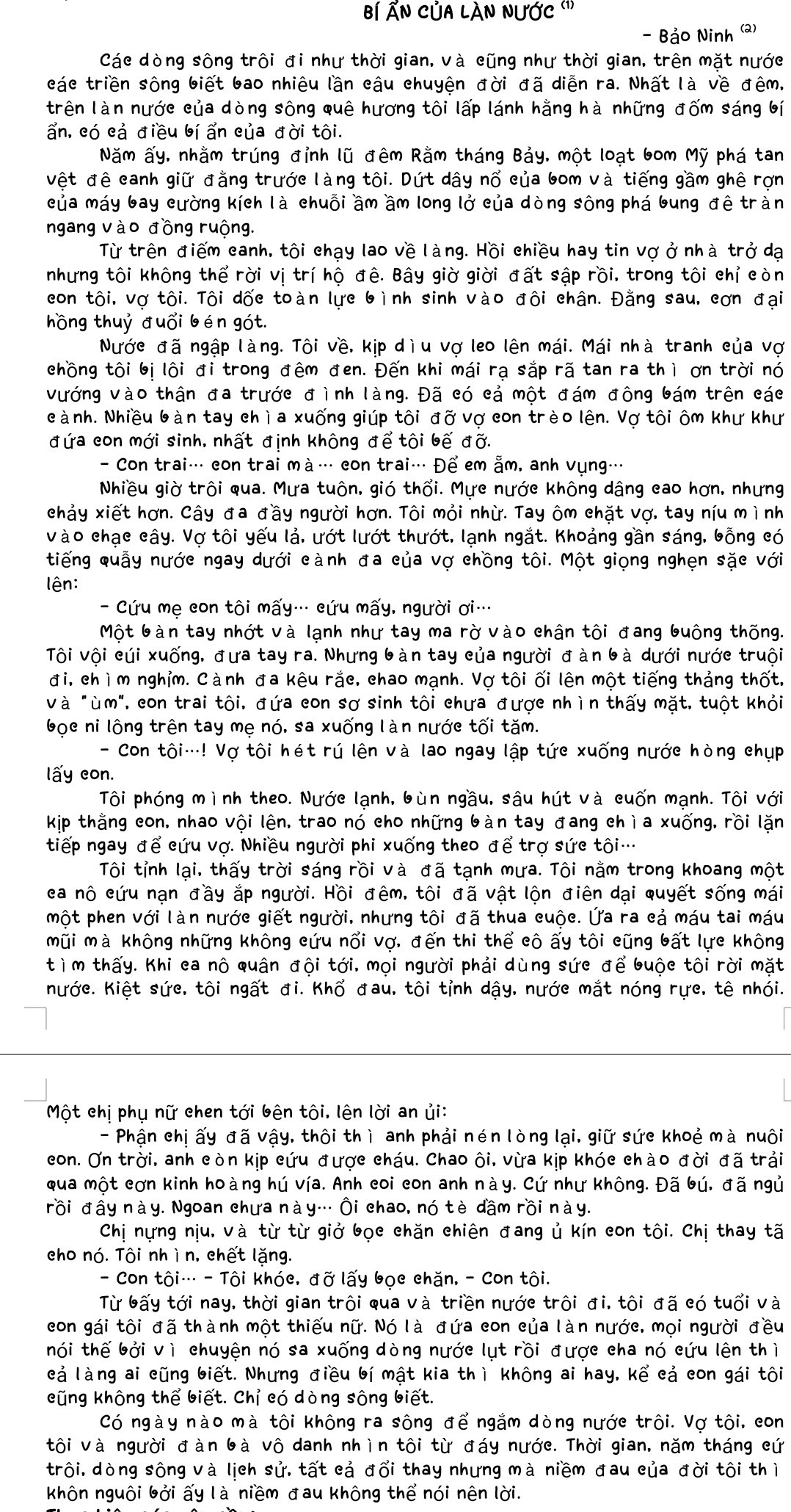 "Đã cả một đám đông bám trên các cành. Nhiều bàn tay chìa xuống giúp tôi đỡ vợ con trèo lên. Vợ tôi ôm khư khư đứa con mới sinh, nhất định không để tôi bế đỡ.