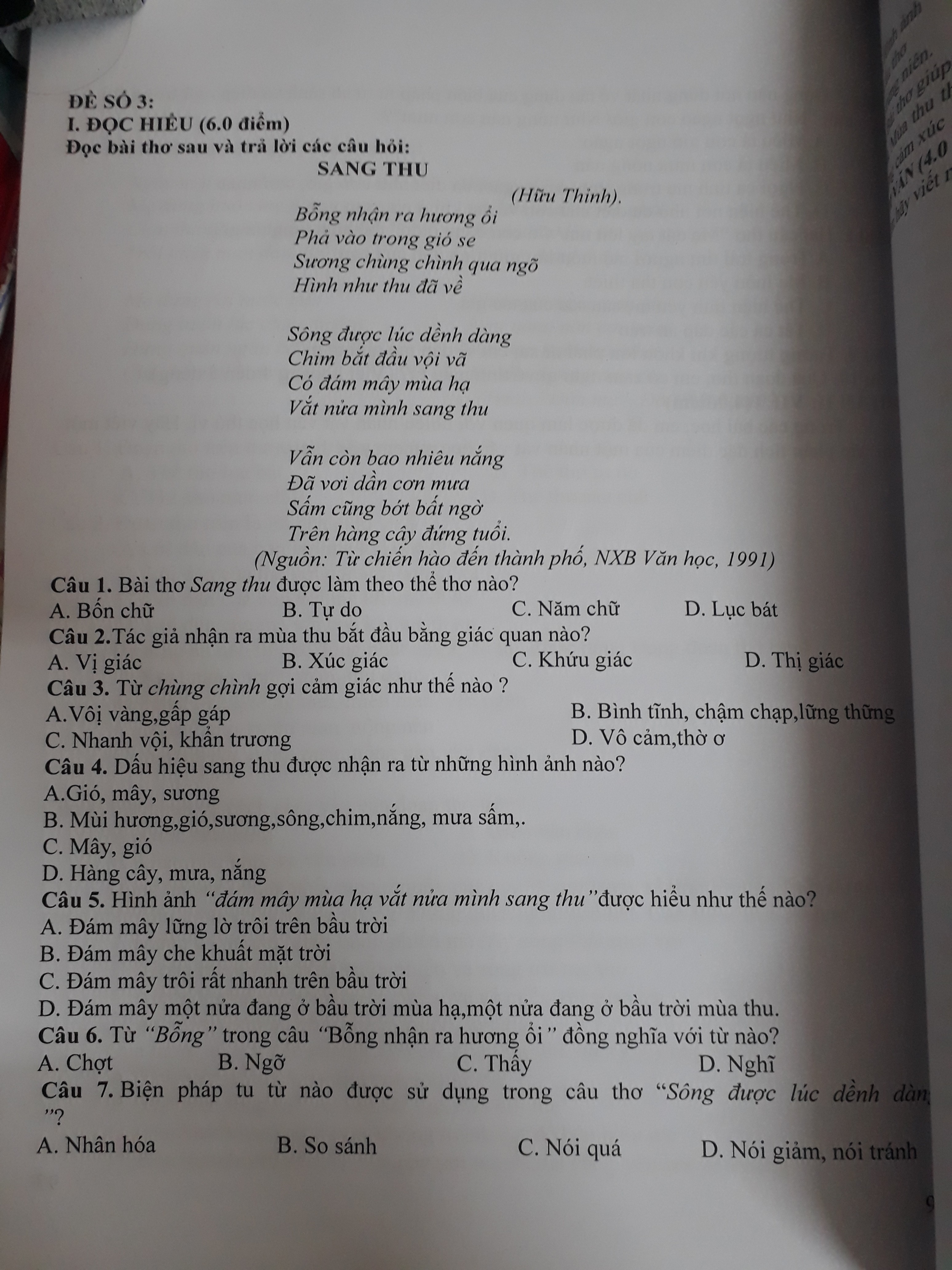 Câu 9: Bài thơ “Sang Thu” của Hữu Thỉnh mang đến cho người đọc một thông điệp ý nghĩa về sự đổi mới, sự thay đổi và sự kiên trì trong cuộc sống. Tác giả cho thấy rằng, dù là những thay đổi nhỏ nhặt nhưng rõ ràng trong mùa thu, những thay đổi đó vẫn đủ để gợi lên trong lòng tác giả sự nhạy cảm và chân thật.