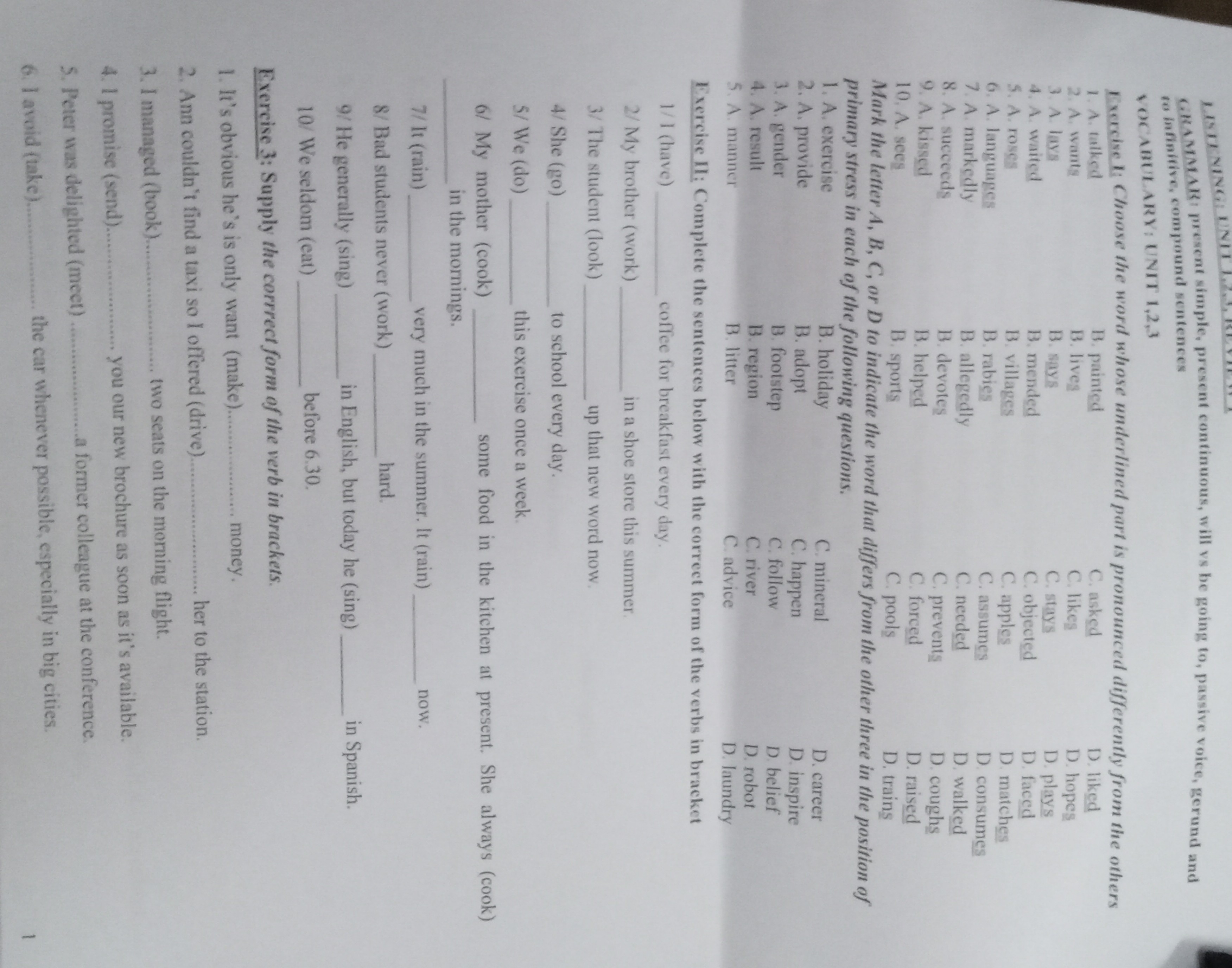 VOCABULARY: Bạn cần cung cấp thêm thông tin về UNIT 1,2,3 từ sách giáo trình nào để tôi có thể giúp bạn.