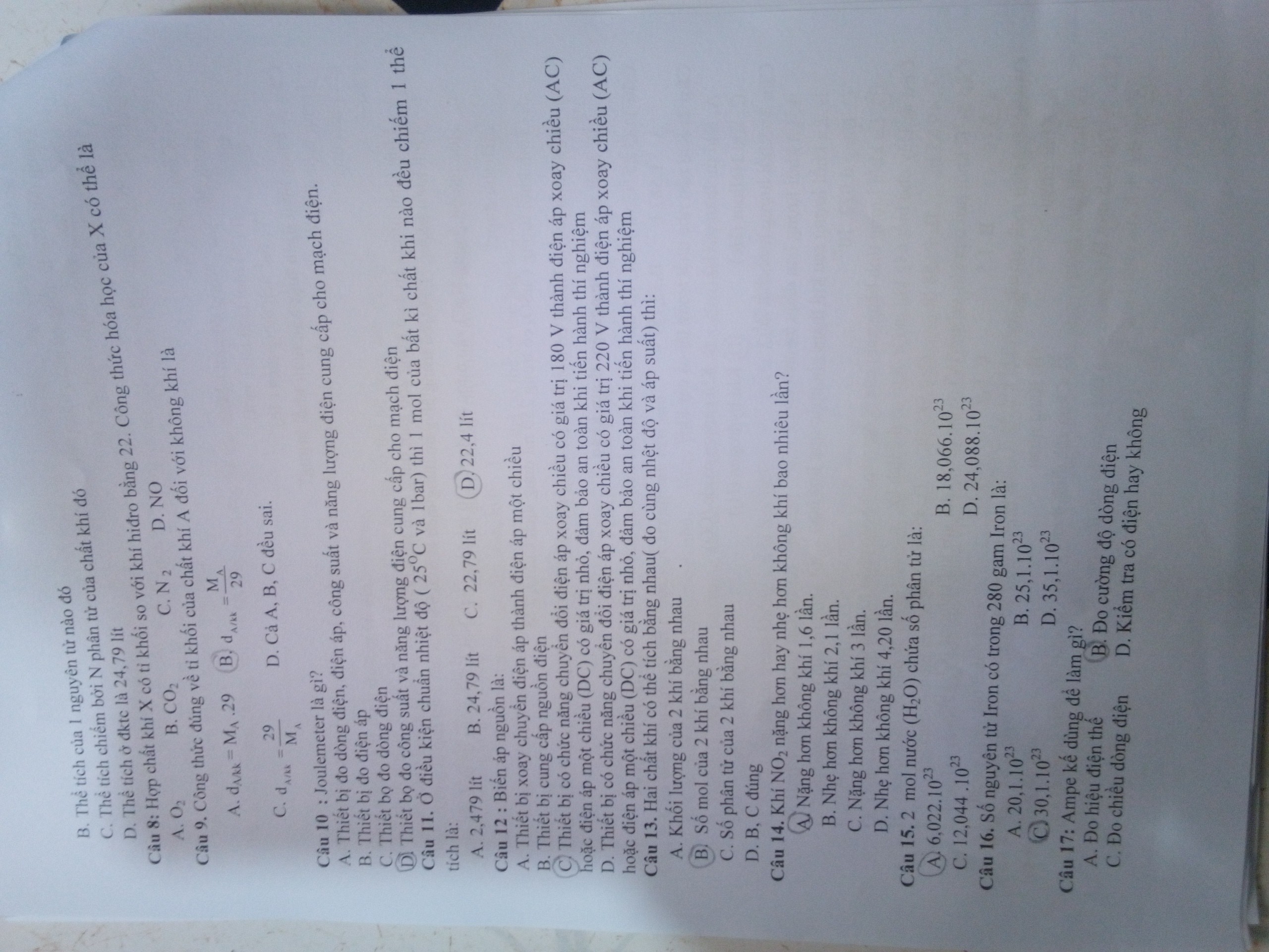 Câu II: Ở điều kiện chuẩn nhiệt độ (25°C và áp suất 1 atm), thể tích của bất kỳ chất khí nào là D. 22,4 lit.