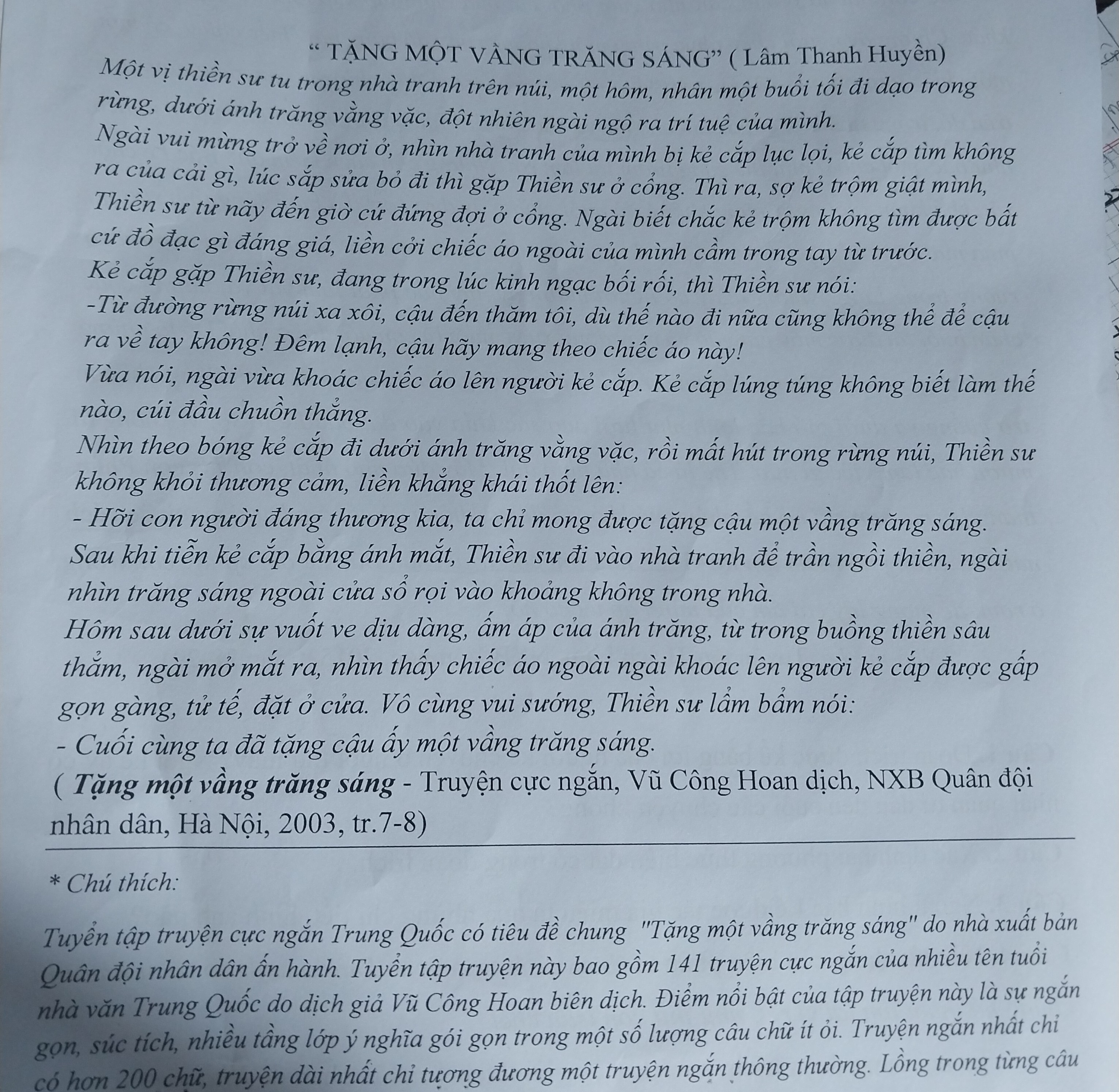 Khi tên trộm bỏ đi xuống núi, lúc này nhà sư còn nhìn theo và không ngừng cảm thương nói rằng: “Rất đáng thương. Tôi muốn tặng cho anh cả một vầng trăng để chiếu sáng con đường cho anh xuống núi”, đó chính là sự bao dung, yêu thương giữa người với người, đây chính là thứ tình cảm đáng quý và đáng trân trọng hơn bao giờ hết. Không lâu sau đó, vào một buổi sáng đẹp trời, thiền sư thấy chiếc áo mà mình tặng cho tên trộm hôm nào đã được xếp gọn gàng và ngay ngắn trước cửa.
