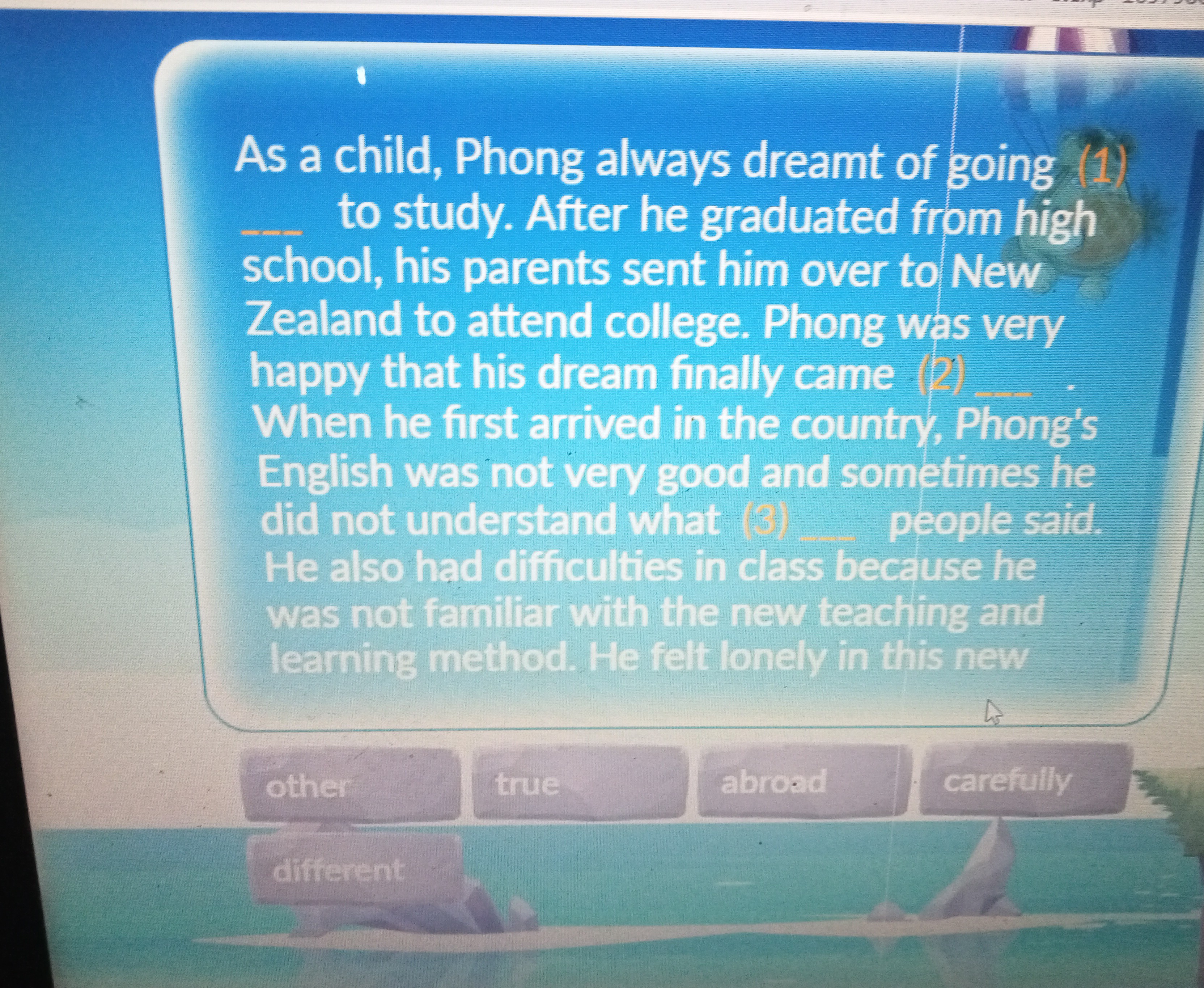 As a child, Phong always dreamt of going abroad to study. After he graduated from high school, his parents sent him to New Zealand to attend college. Phong was very happy that his dream finally came true. When he first arrived in the country, Phong's English was not very good and sometimes he did not understand what people were saying. He also had difficulties in class because he was not familiar with the new teaching and learning methods.