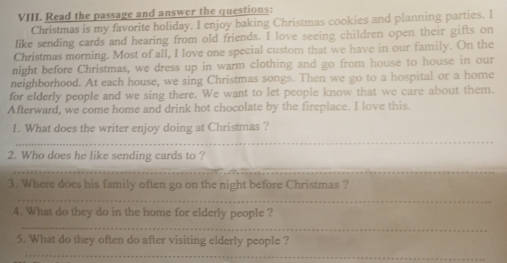 5. Sau khi thăm người già, họ thường về nhà và uống sô cô la nóng bên lò sưởi.