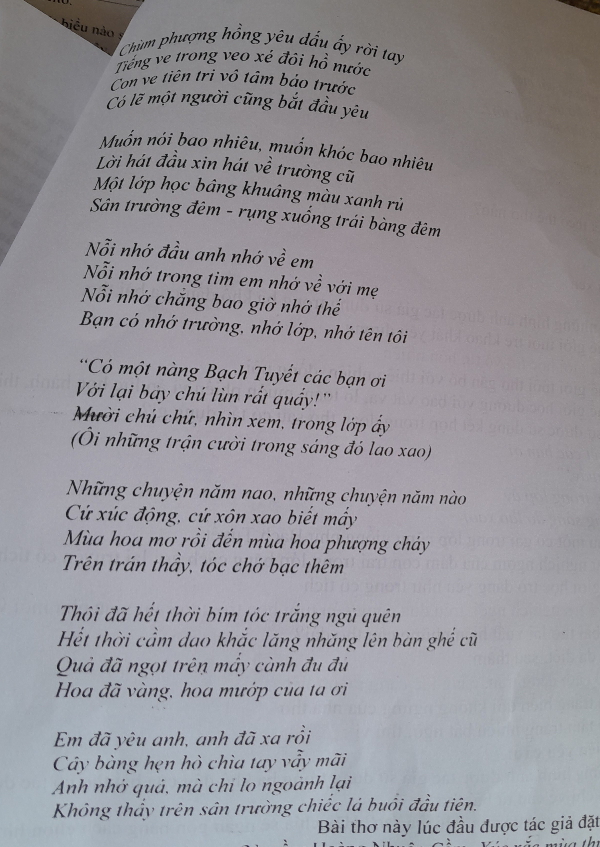 Ở những khổ thơ tiếp theo, hình ảnh gắn liền với tuổi học trò "hoa súng tím", "chùm phượng hồng", "tiếng ve", "con ve" xuất hiện dày đặc. Trong đôi mắt của nhân vật trữ tình, bông hoa súng mang đến cảm giác say đắm, thích thú "Hoa súng tím vào trong mắt lắm mê say". Có lẽ, tình yêu ở lứa tuổi học trò đều bắt nguồn từ tình bạn. Nhân vật trữ tình bồi hồi nhớ về một thời "yêu dấu" đã qua, nhớ về cảm giác chùm phượng hồng phút ban đầu. Chùm phượng nở rộ cũng là lúc một năm học chuẩn bị kết thúc. Phút giây ấy còn được báo hiệu bởi tiếng "ve tiên tri". Tiếng ve là âm thanh đặc trưng của mùa hạ, cũng là mùa chia tay mái trường, thầy cô. Biện pháp nhân hóa "con ve tiên tri vô tâm báo trước" đã cho thấy sự bàng hoàng, tiếc nuối đến ngỡ ngàng. Dòng cảm xúc của nhân vật trữ tình đang trở lại mùa hè năm ấy, về lần đầu mình biết yêu.