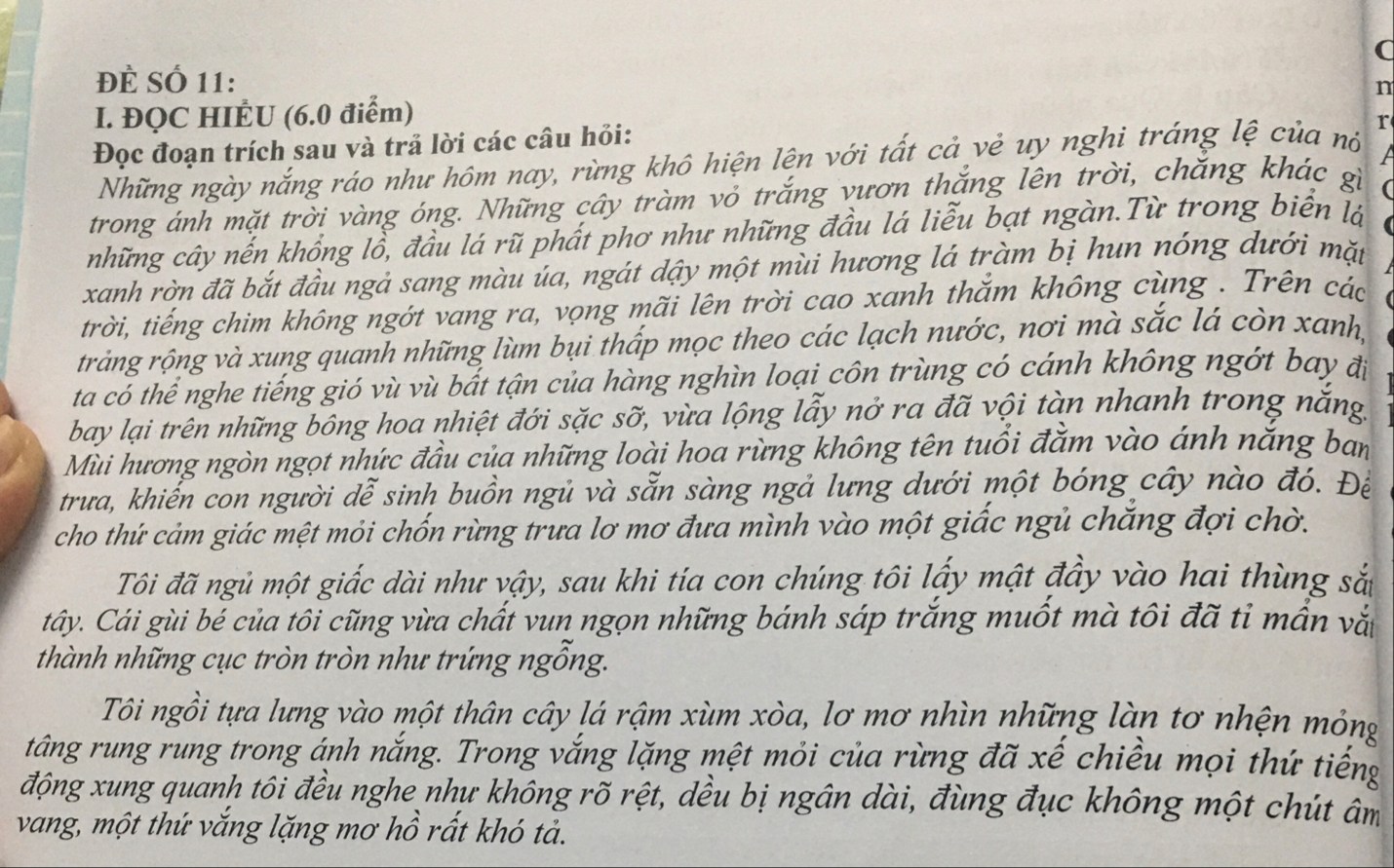 Câu 2: Bức tranh thiên nhiên đất rừng phương Nam được nhà văn Đoàn Giỏi khắc hoạ trong đoạn trích trên mang lại cho tôi cảm giác thú vị và hùng vĩ. Rừng khô hiện lên với vẻ uy nghi tráng lệ trong ánh mặt trời vàng óng. Những cây tràm vươn thẳng lên trời như những cây nến khổng lồ, đầu lá rũ phất phơ như những đầu lá liễu bạt ngàn. Mùi hương lá tràm bị hun nóng dưới mặt trời lan tỏa khắp nơi, tiếng chim không ngớt vang ra, vọng mãi lên trời cao xanh thẳm. Trên các trảng rộng và xung quanh những lùm bụi thấp mọc theo các lạch nước, ta có thể nghe tiếng gió vù vù bất tận của hàng nghìn loại côn trùng có cánh không ngớt bay đi bay lại trên những bông hoa nhiệt đới sặc sỡ. Mùi hương ngòn ngọt nhức đầu của những loài hoa rừng không tên tuổi đằm vào ánh nắng ban trưa. Tôi cảm nhận được sự mệt mỏi chốn rừng trưa, nhưng cũng có sự thú vị và hứng khởi khi được ngả lưng dưới bóng cây và ngủ một giấc dài. Bức tranh này mang đến cho tôi cảm giác yên bình và thư thái, nhưng cũng có sự huyền ảo và khó tả.