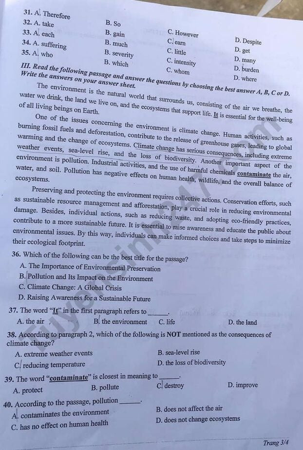 37. Trong đoạn văn đầu tiên, "It" có thể chỉ đến "the environment" (B).