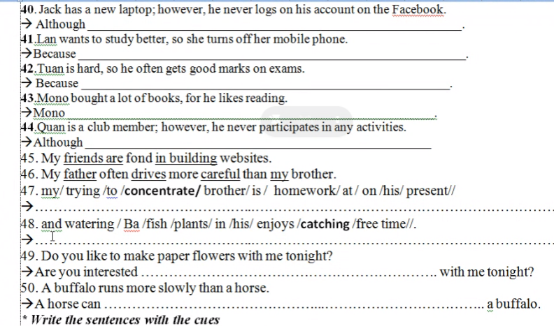 42. Because Tuan is hardworking, he often gets good marks on exams.