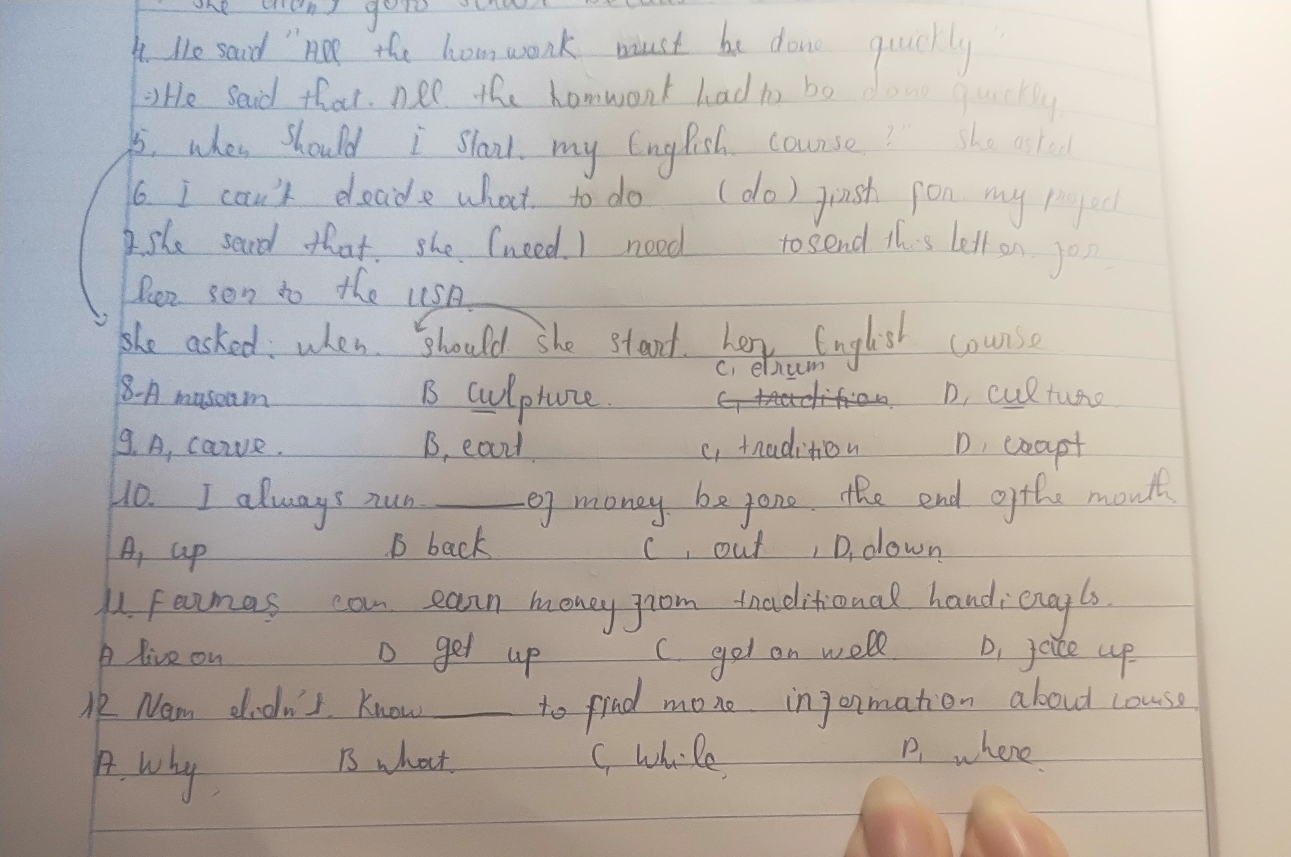 10. "I always run _ of money before the end of the month." - Câu trả lời phù hợp nhất cho chỗ trống trong câu này là "out", vì "run out of" có nghĩa là hết cái gì đó, trong trường hợp này là tiền.