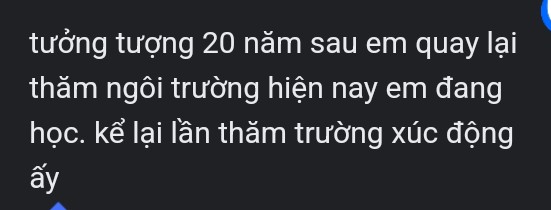 Trong tưởng tượng của tôi, sau 20 năm xa cách, tôi quyết định quay lại thăm ngôi trường hiện tại mà tôi đang học. Buổi sáng đầu hè, khi những tia nắng đầu tiên chiếu rọi xuống, tôi bước vào cổng trường với trái tim đầy xúc động.