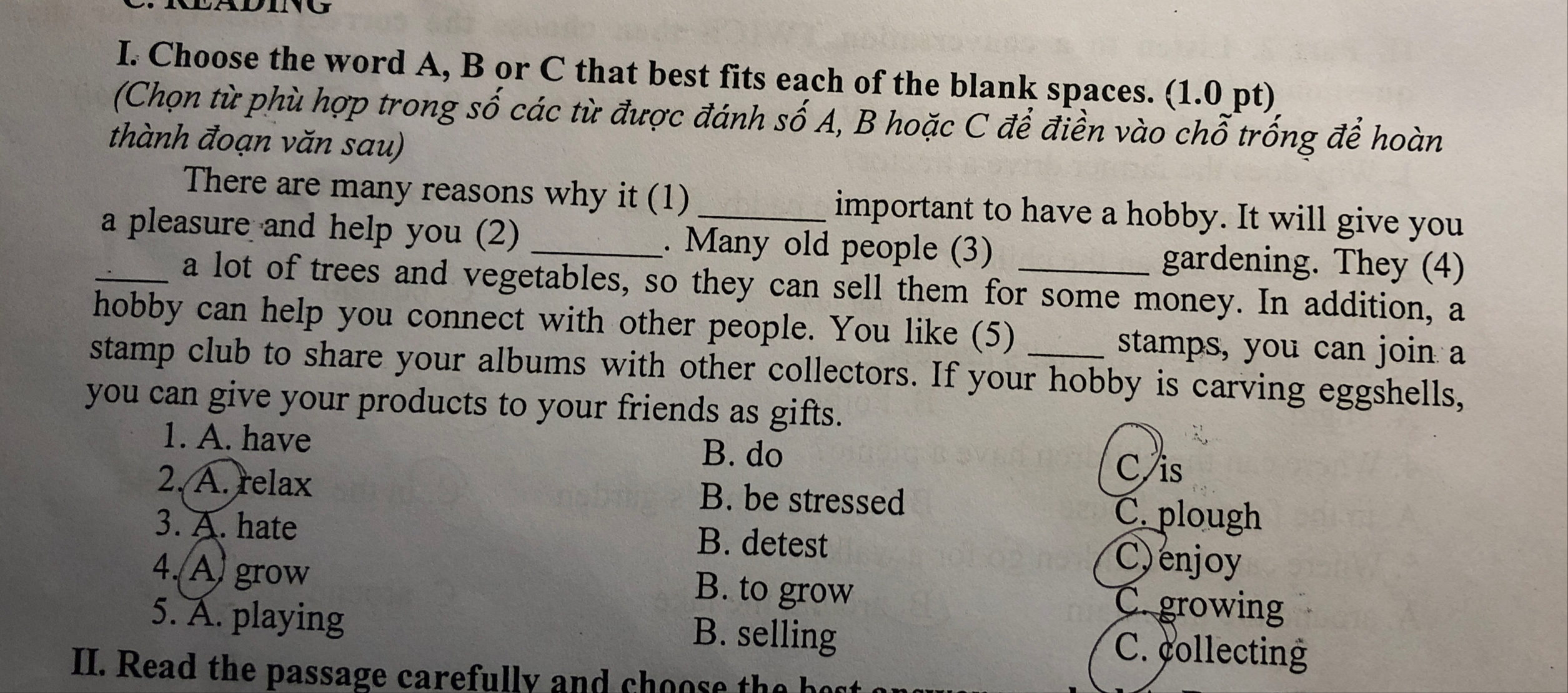 Vậy, đoạn văn hoàn chỉnh sẽ là: "There are many reasons why it is important to have a hobby. It will give you a pleasure and help you relax. Many old people enjoy gardening. They grow a lot of trees and vegetables, so they can sell them for some money. In addition, a hobby can help you connect with other people. If you like collecting stamps, you can join a stamp club to share your albums with other collectors. If your hobby is carving eggshells, you can give your products to your friends as gifts."
