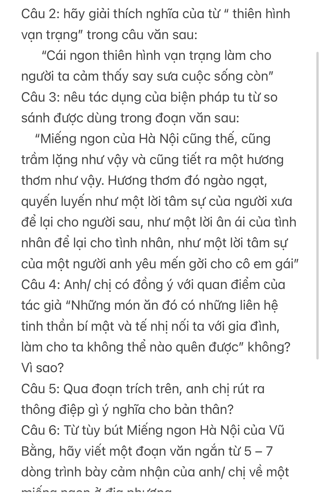 Câu 5: Qua đoạn trích trên, anh chị rút ra thông điệp: Phải gìn giữ nét đẹp, những món ăn ẩm thực của quê hương.