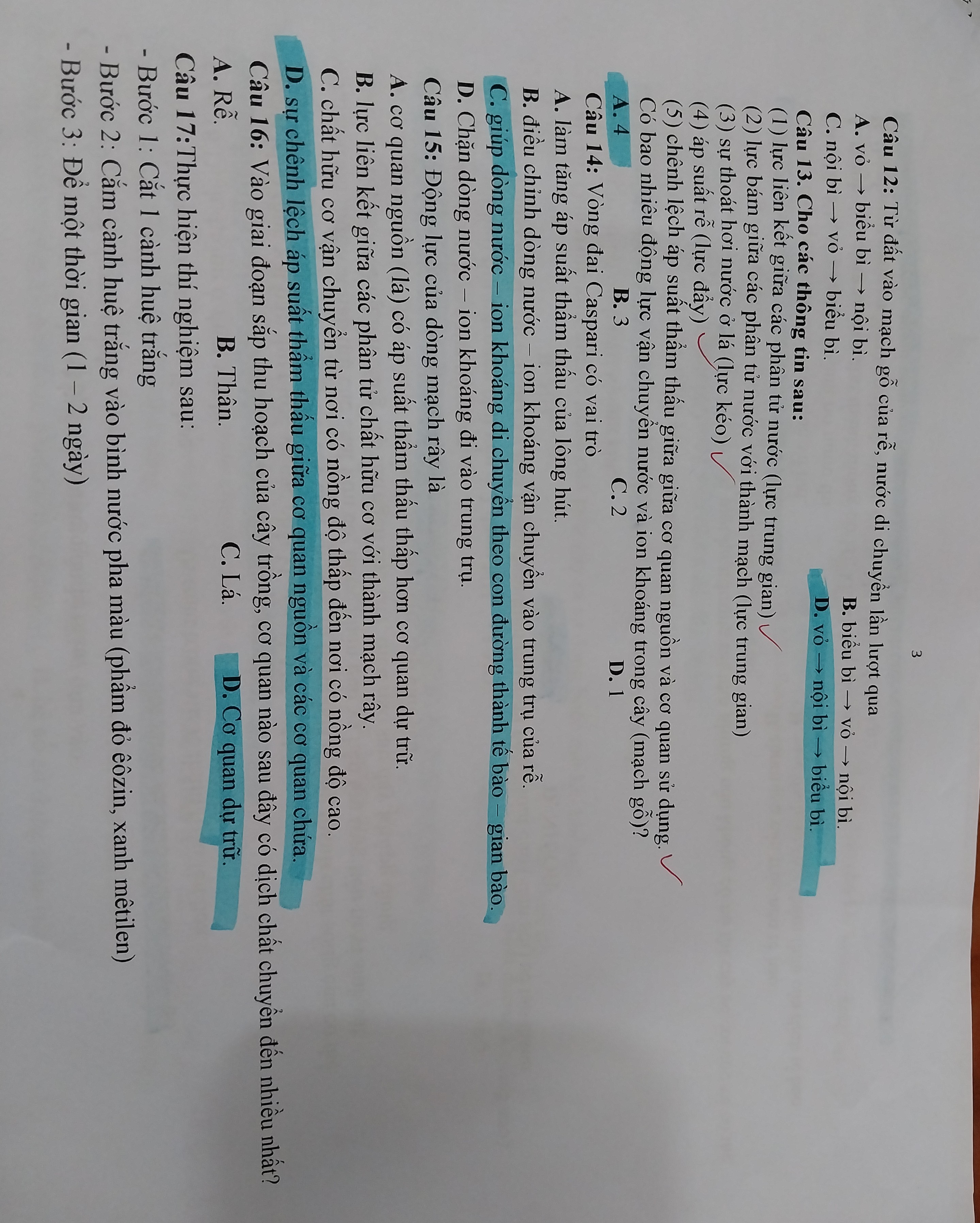 Câu 15: Động lực của dòng mạch rây là D. sự chênh lệch áp suất thẩm thấu giữa cơ quan nguồn và các cơ quan chứa.