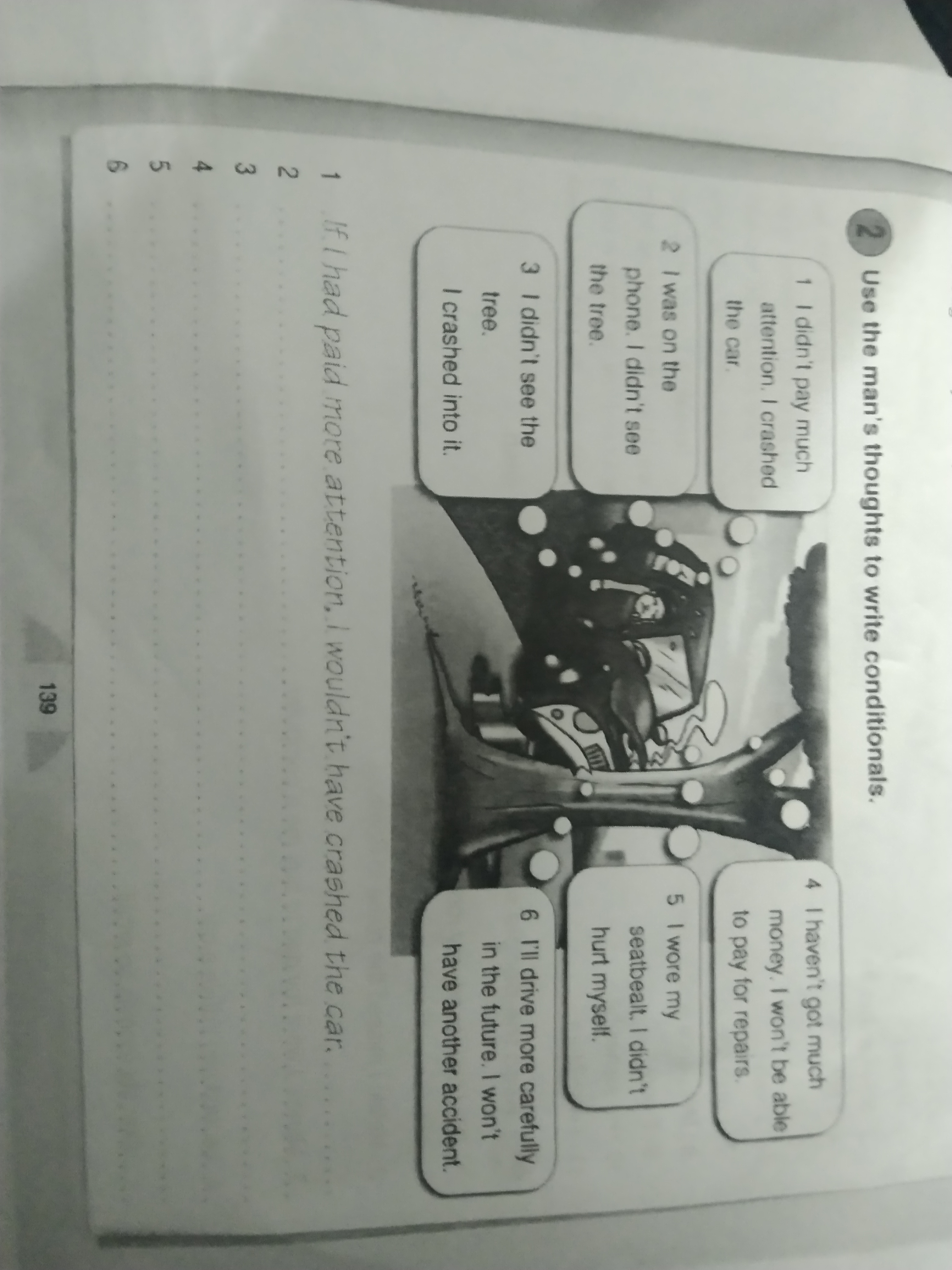 2. If I hadn't been on the phone, I would have seen the tree. 3. If I had seen the tree, I wouldn't have crashed into it. 4. If I had more money, I would be able to pay for repairs. 5. If I hadn't worn my seatbelt, I might have hurt myself.