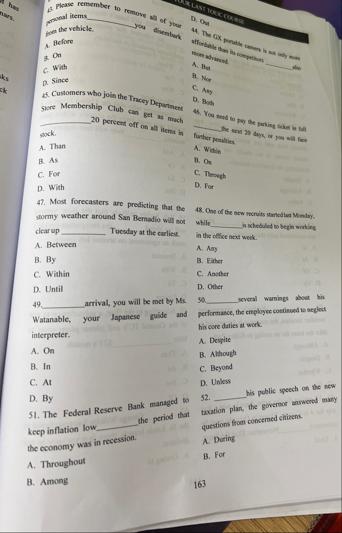 51. A. Throughout - "Throughout" được sử dụng để chỉ suốt một khoảng thời gian hoặc ở mọi nơi trong một khu vực. Trong trường hợp này, Ngân hàng Dự trữ Liên bang đã giữ cho lạm phát thấp suốt thời gian kinh tế suy thoái.