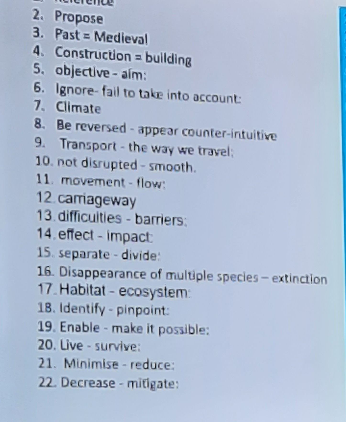 2. Đề xuất 3. Quá khứ = Thời Trung cổ 4. Xây dựng = Tòa nhà 5. Mục tiêu - mục đích 6. Bỏ qua - không xem xét 7. Khí hậu 8. Đảo ngược - xuất hiện trái với trực giác 9. Vận chuyển - cách chúng ta di chuyển 10. Không bị gián đoạn - trôi chảy 11. Di chuyển - dòng chảy 12. Đường xe chạy 13. Khó khăn - rào cản 14. Hiệu ứng - tác động 15. Tách biệt - phân chia 16. Sự biến mất của nhiều loài - tuyệt chủng 17. Môi trường sống - hệ sinh thái 18. Xác định - chỉ ra cụ thể 19. Kích hoạt - làm cho nó có thể 20. Sống - sống sót 21. Giảm thiểu - giảm 22. Giảm - giảm nhẹ