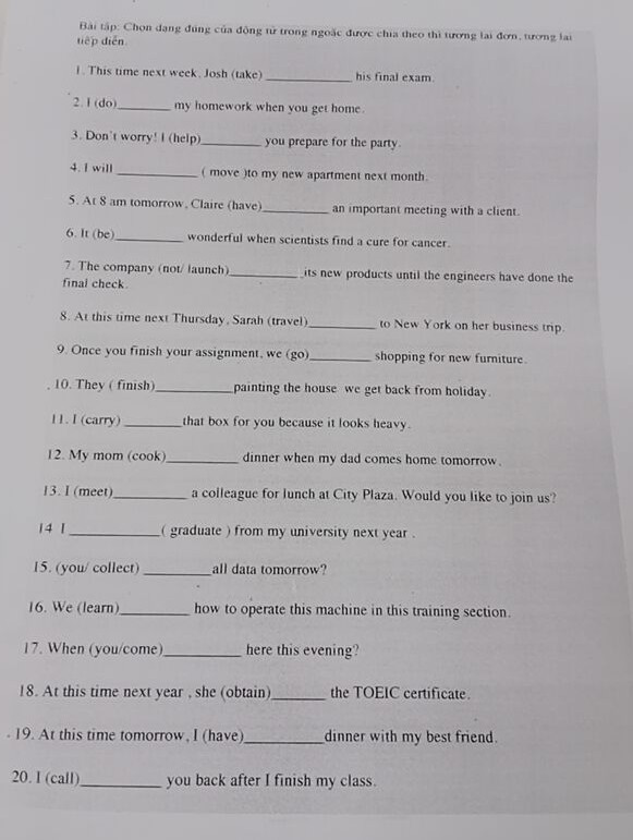1. This time next week, Josh (will be taking) his final exam.