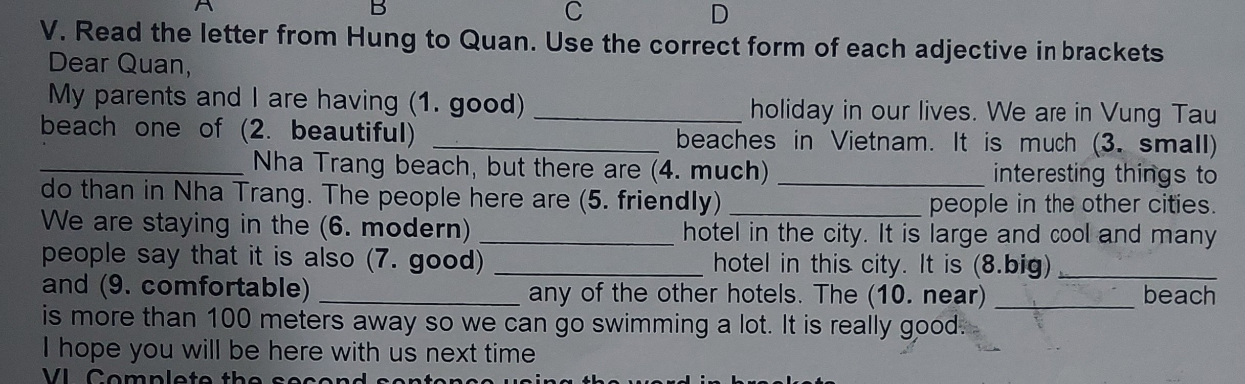 My parents and I are having the (1. best) ______________ holiday in our lives. We are in Vung Tau beach, one of the (2. most beautiful) ________________ beaches in Vietnam. It is much (3. smaller) than Nha Trang beach, but there are (4. more) ________________ interesting things to do than in Nha Trang. The people here are (5. friendlier) _______________ than anywhere else. We are staying in the (6. most modern) ______________ hotel in the city. It is large and cool and many people say that it is also the (7. best) _____________ hotel in this city. It is (8. bigger) __________ and (9. more comfortable) _____________ than any of the other hotels. The (10. nearest) _________ beach is more than 100 meters away so we can go swimming a lot. It is really good.
