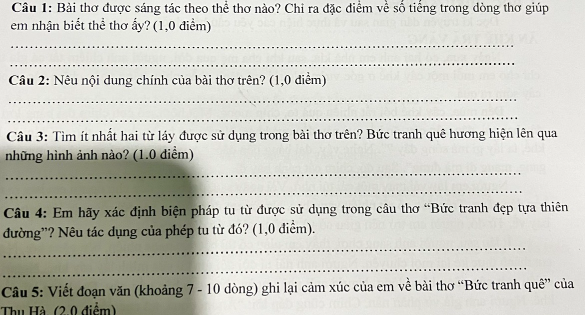 Câu 1: Bài thơ "Bức tranh quê" của tác giả Thu Hà được sáng tác theo thể thơ tự do. Đặc điểm về số tiếng trong dòng thơ không cố định, tùy thuộc vào ý tưởng và cảm xúc mà tác giả muốn truyền đạt.