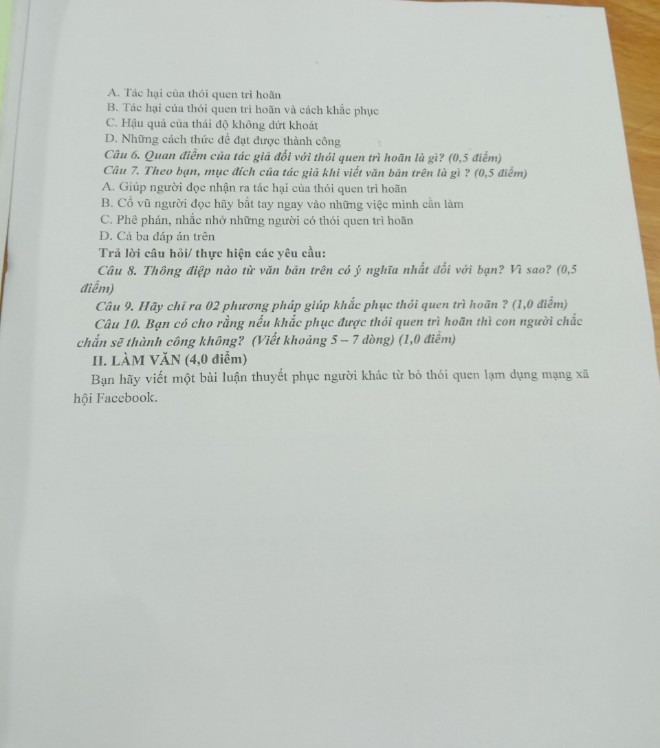 Câu 10. Bạn có cho rằng nếu khắc phục được thói quen trì hoãn thì con người chắc