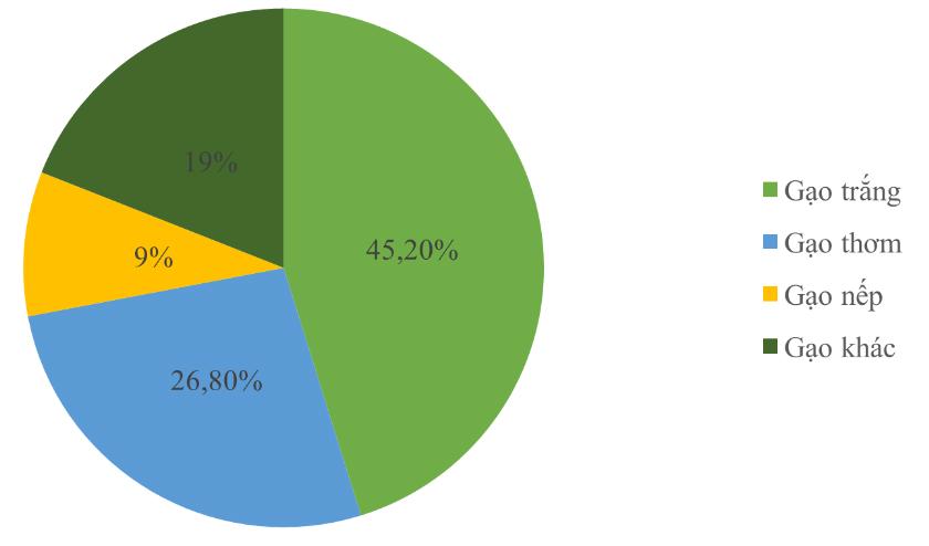 b. Gạo xuất khẩu nhiều nhất là gạo trắng (45.2%) và ít nhất là gạo nếp (9%).