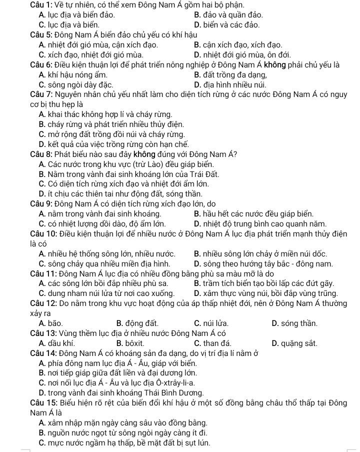 Câu 1: A. lục địa và biển đảo.