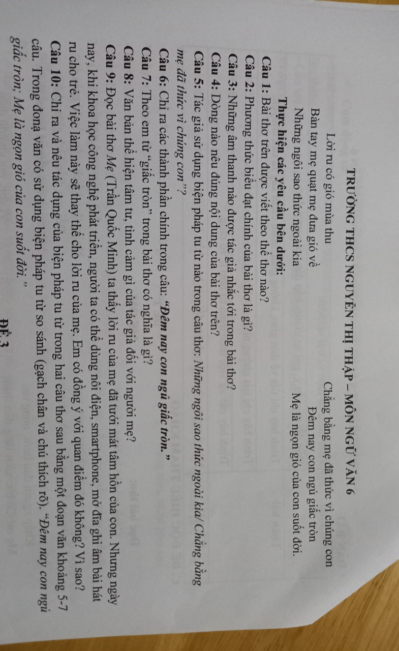 Câu 4. Dòng nêu đúng nội dung của bài thơ trên: Mẹ là ngọn gió của con suốt đời.
