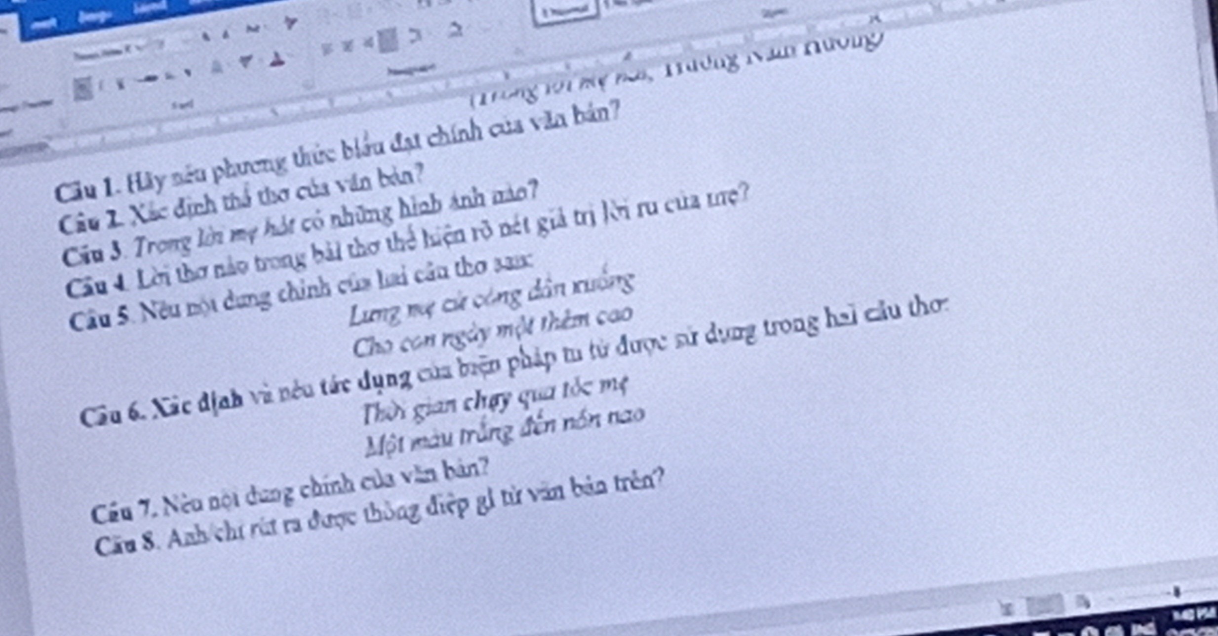 7. Nội dung chính của đoạn thơ trên: Bộc lộ niềm xót xa và lòng biết ơn của người con trước những hi sinh thầm lặng của người mẹ.