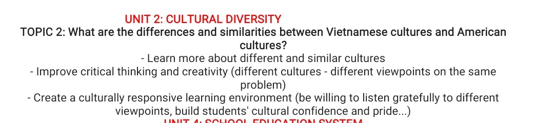 Let's talk about the differences. In terms of language, Vietnamese uses a different script and structure compared to English in American culture. For example, Vietnamese is a tonal language, while English is not. Regarding cuisine, Vietnamese food often centers around rice and unique flavors, whereas American cuisine is diverse and includes a variety of fast food options. Social customs, like greetings and gestures, vary between the two cultures, influencing communication styles. Additionally, core values differ; for instance, the importance of collectivism in Vietnamese culture contrasts with the emphasis on individualism in American culture.