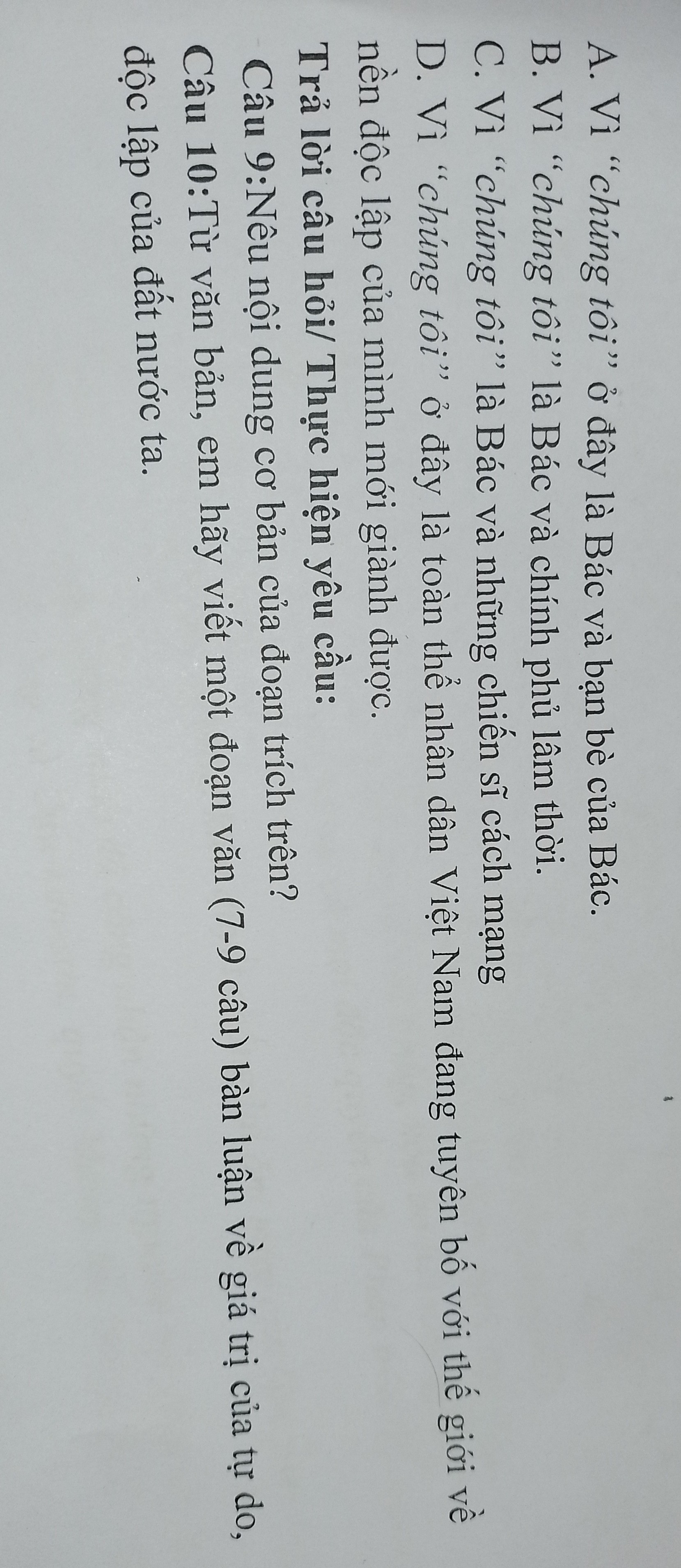 Câu 8: Chúng tôi là chỉ tất cả những người dân Việt Nam, tác giả muốn thay mặt nhân dân Việt Nam để công bố với toàn thế giới.