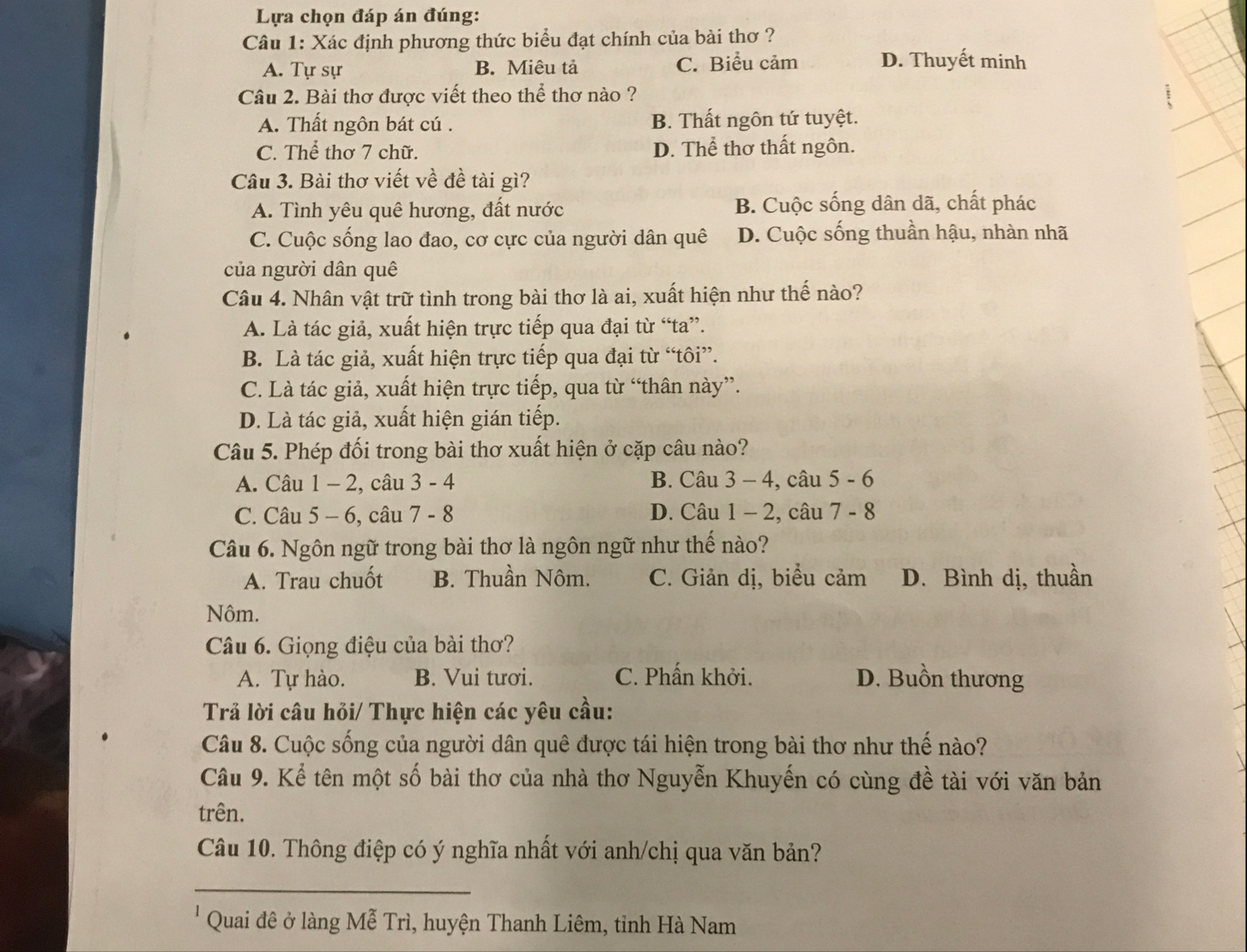 Câu 10. Thông điệp có ý nghĩa nhất : Cảm thông, xót xa cho cảnh quê hương trong lụt lội, mất mùa. Qua đó, thức tỉnh mọi người ý thức gìn giữ, bảo tồn văn hóa, truyền thống quê hương ; Tích cực lao động sản xuất làm giàu cho quê hương.